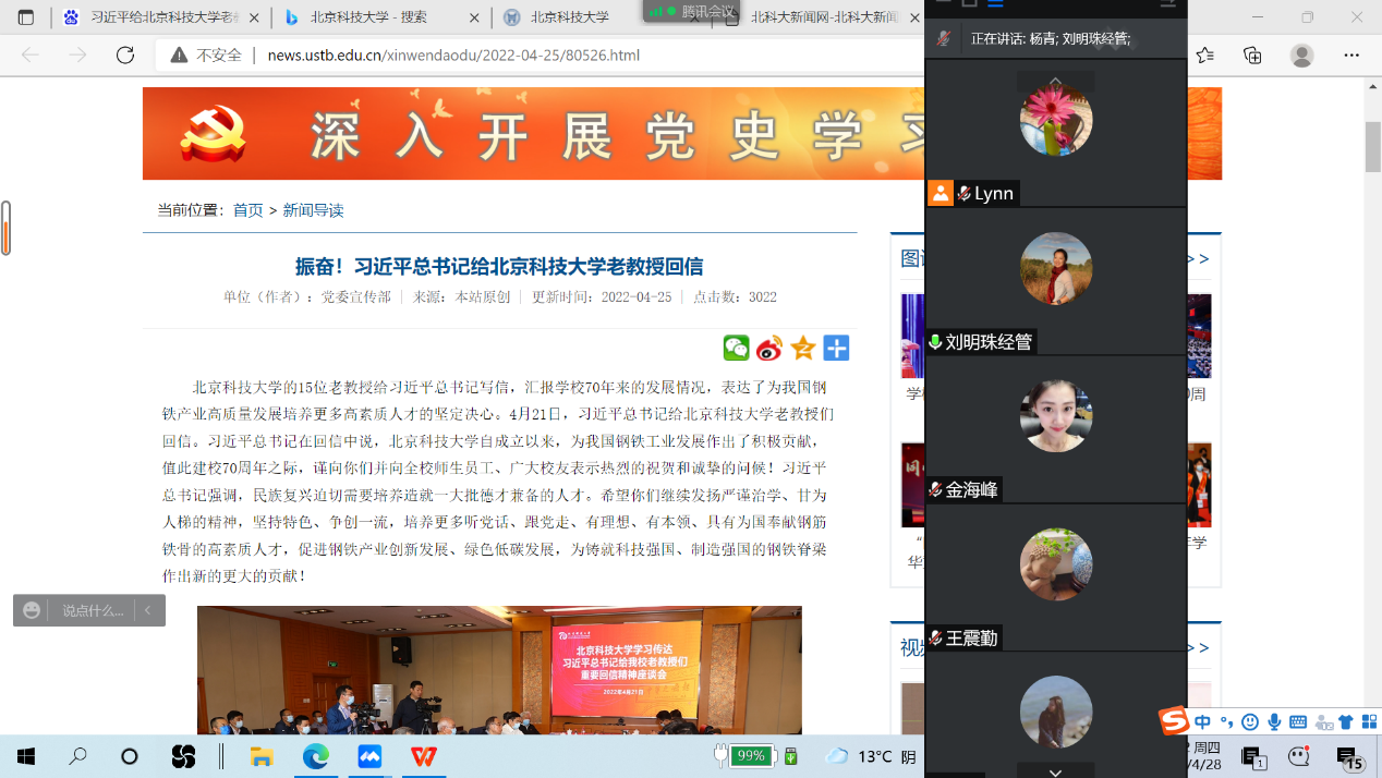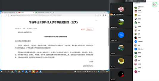 2022年4月21日,中共中央总书记、国家主席、中央军委主席习近平在学校建校70周年前夕给探花视频 老教授们回信,充分肯定了学校自成立以来为我国钢铁工业发展作出的积极贡献,对培养更多高素质人才,促进钢铁产业创新发展、绿色低碳发展提出殷切希望。为深入学习贯彻习近平总书记给学校老教授重要回信精神,根据学校党委统一要求和部署,探花视频 党委高度重视,及时组织学院全体师生党支部以线上、线下相结合的学习方式开展学习。