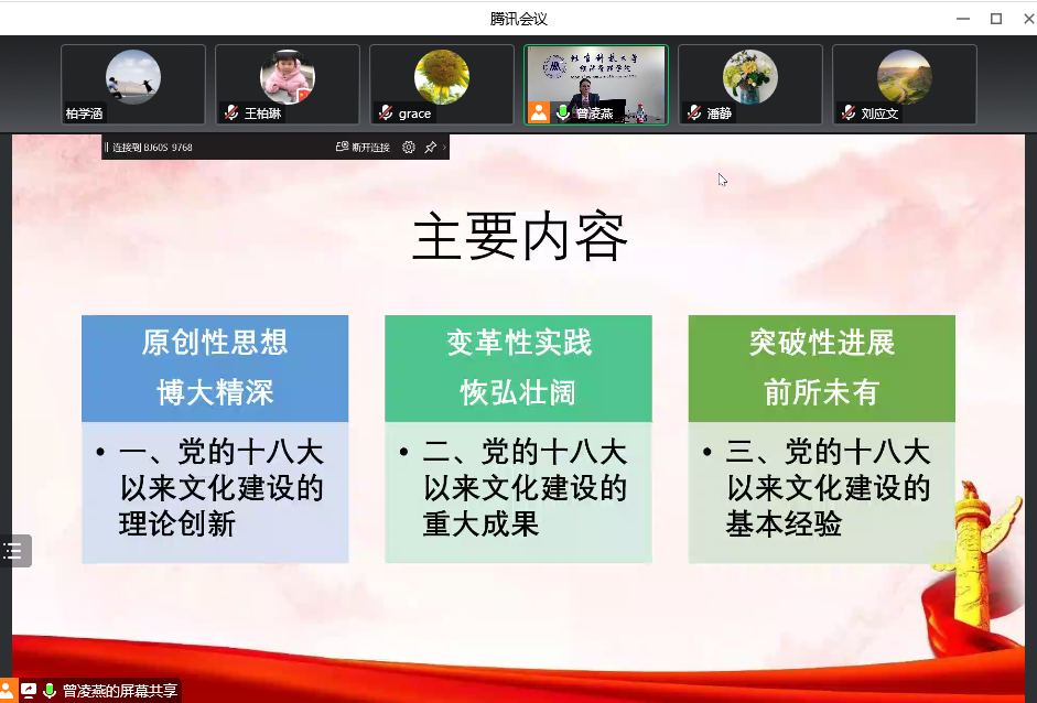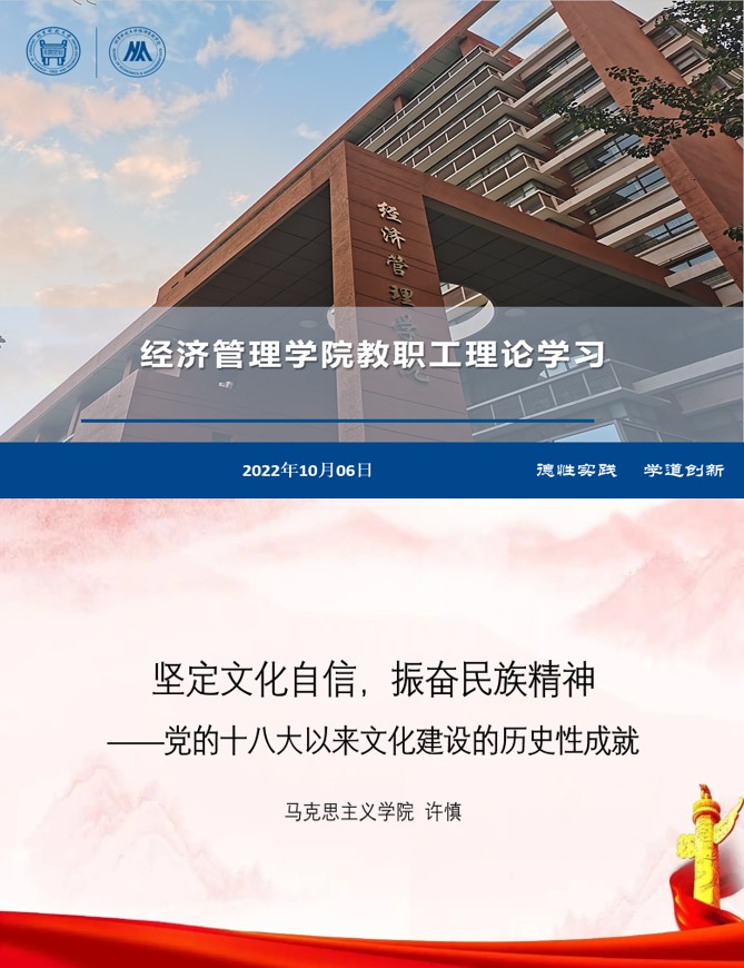 为深入学习贯彻习近平新时代中国特色社会主义思想、党的十九大和十九届历次全会精神,弘扬伟大建党精神,充分宣传展示党和国家事业取得的历史性成就、发生的历史性变革,进一步振奋精神、凝聚力量,在党的二十大召开之际,根据学校党委开展“新时代新成就”宣讲活动的工作安排,2022年10月6日下午,探花视频 组织全院教职工理论学习,开展《坚定文化自信,振奋民族精神——党的十八大以来文化建设的历史性成就》专题宣讲活动。本次学习活动邀请了学校马克思主义学院许慎副教授做主题宣讲,以线上和线下形式结合进行,学院全体院领导、党委委员和教职工党支部书记在经管楼809参加学习,学院全体教职工在线上参加学习,会议由学院党委书记武森主持。