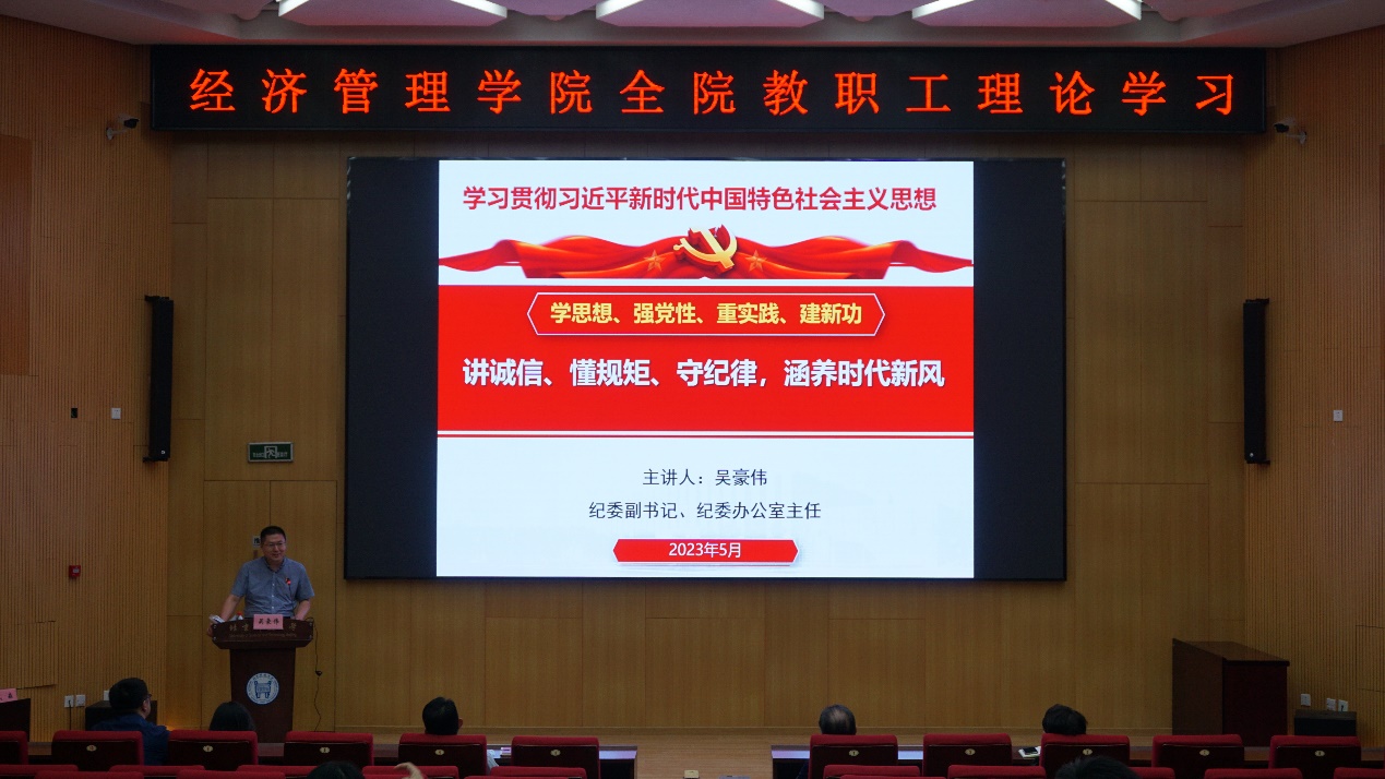 为深入开展学习贯彻习近平新时代中国特色社会主义思想主题教育,扎实推进学院主题教育工作,深刻领悟习近平总书记关于教育的重要论述,深刻理解习近平总书记给我校师生的两封重要回信精神,进一步加强全体教职工思想政治和师德师风工作,根据学校2023年党风廉政宣传教育月活动安排,2023年5月25日下午,探花视频 组织全院教职工理论学习,开展专题教育培训,邀请学校纪委副书记、纪委办公室主任、学校主题教育专项联络组三组组长吴豪伟以《讲诚信、懂规矩、守纪律,涵养时代新风》为主题进行专项培训。学院全体教职工参加学习,会议由学院党委书记武森主持。