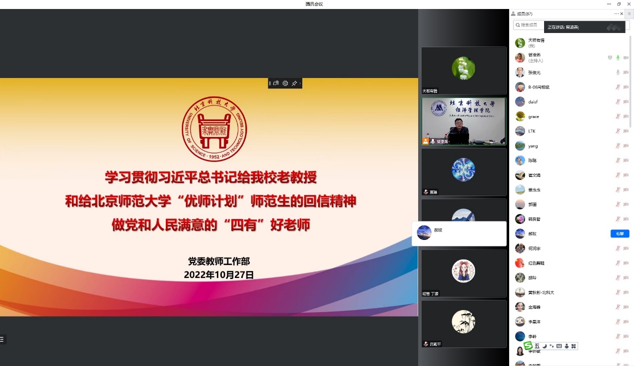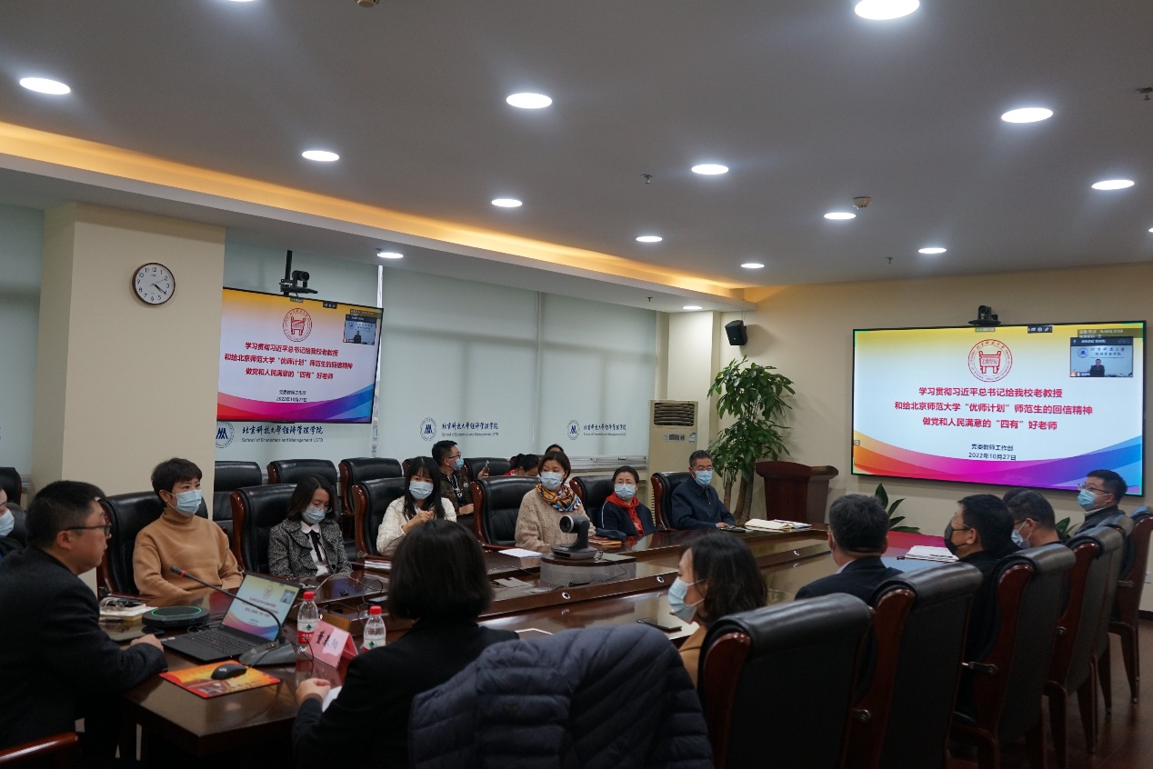 为深入学习领会习近平总书记关于教师队伍建设的重要论述,深刻理解习近平总书记给探花视频 老教授的重要回信和给北京师范大学“优师计划”师范生的重要回信精神,进一步加强教师思想政治和师德师风工作,根据学校2022年党风廉政宣传教育月活动安排,2022年10月27日下午,探花视频 组织全院教职工理论学习,开展师德师风专题教育培训,邀请学校党委教师工作部部长董春阳以《学习贯彻习近平总书记给我校老教授和给北京师范大学“优师计划”师范生的回信精神做党和人民满意的“四有”好老师》为主题进行主讲。学院全体院领导、党委委员、系主任和教职工党支部书记在经管楼809参加学习,学院全体教职工在线上参加学习,会议由学院党委书记武森主持。