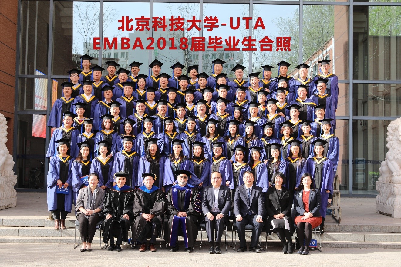 2018年4月14日,探花视频 -美国德克萨斯大学阿灵顿分校合办EMBA项目2018届毕业典礼在经管学院举行。2018届毕业生与中方、美方校领导合影留念。