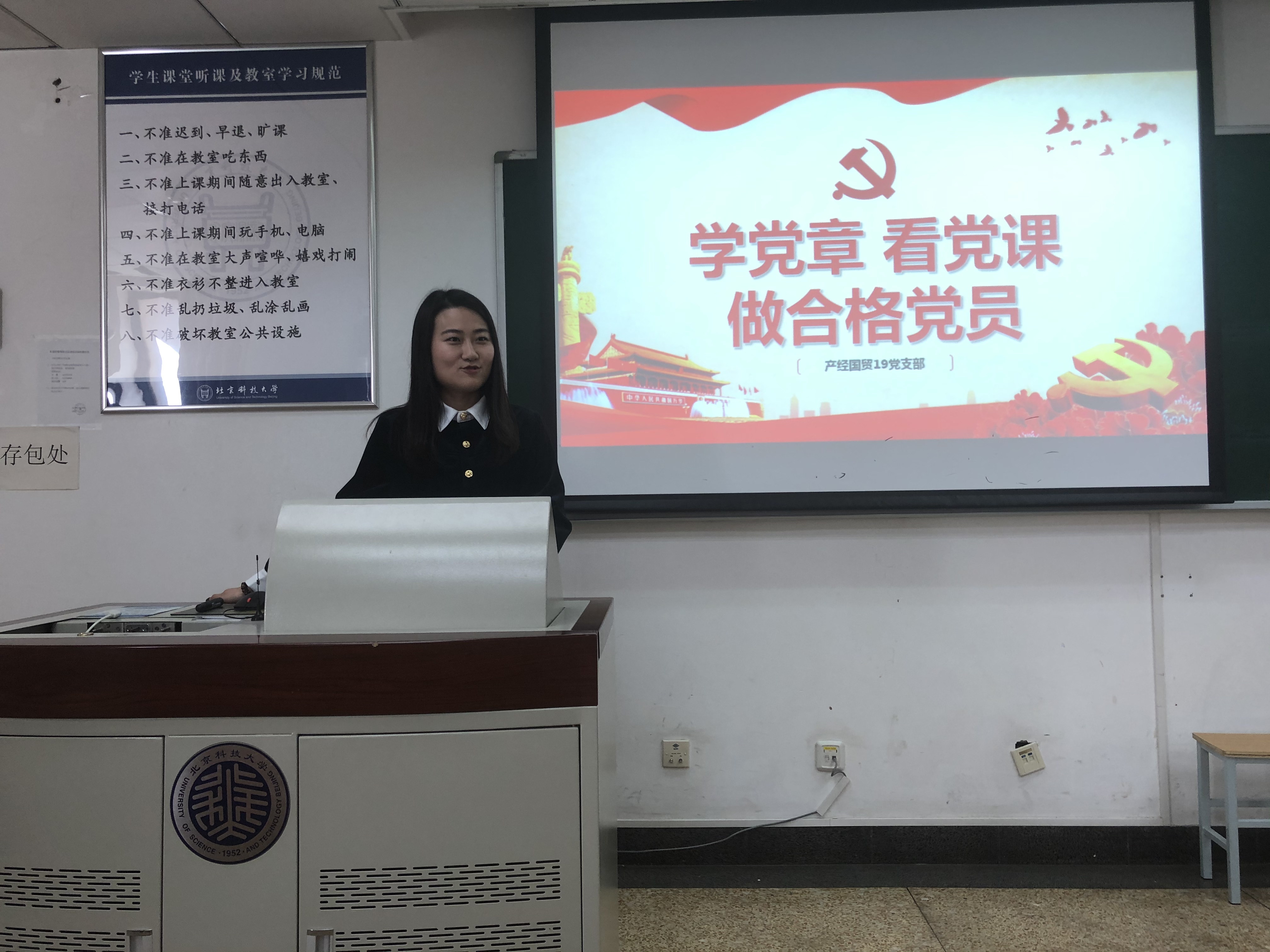 10月31日,东凌探花视频 产经国贸研19党支部在经管楼512开展了“书记讲党课”以及学习《习近平关于‘不忘初心牢记使命’论述摘编》心得分享会,党支部书记刘铮主持会议。