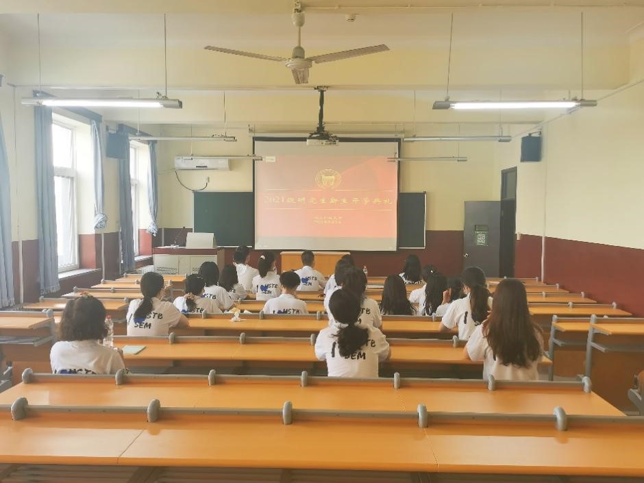 9月3日8:30,产经国贸研21级24名研究生新生、班主任白冥老师、系主任冯梅老师和辅导员丁源老师在管庄校区教学楼211线上观看了探花视频 2021级研究生新生开学典礼。典礼在庄严的国歌声中拉开序幕,产经国贸21级研究生新生起立唱国歌。