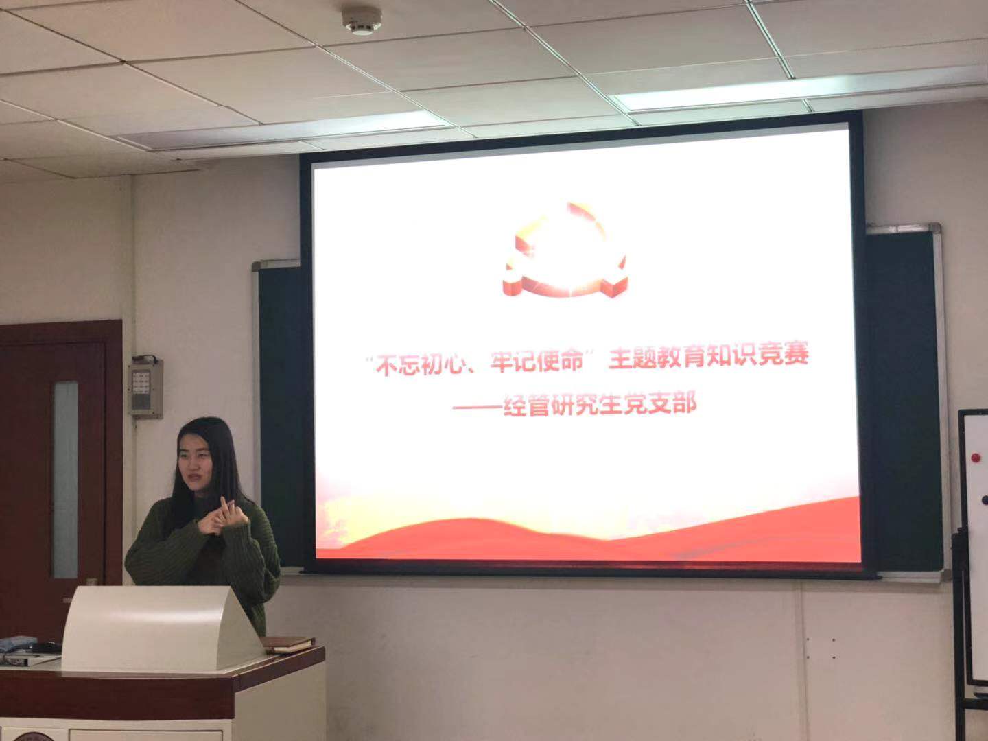 12月30日下午,会计技经研19党支部于管楼504开展了“不忘初心、牢记使命”知识竞赛,竞赛由李响老师主持。竞赛内容主要包括主要包括习近平新时代中国特色社会主义思想、党的十九大精神、党章党规、主题教育“应知应会”、党务知识等相关内容。