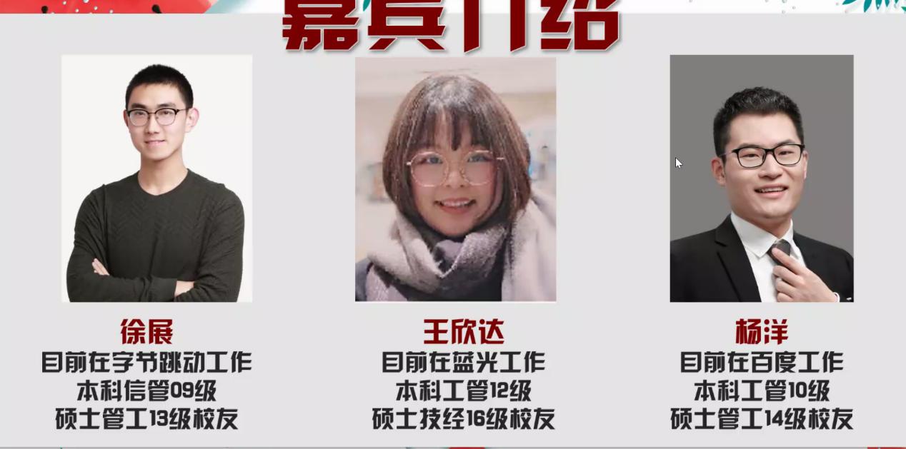 8月24日,探花视频 2019级管理科学与工程类专业介绍会于线上召开,会议由经管学院辅导员张洪榛主持,徐展校友,王欣达校友,杨洋校友受邀参加分享,2019级管理科学与工程大类学生及部分家长参会。