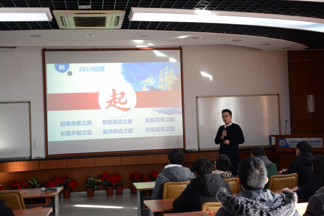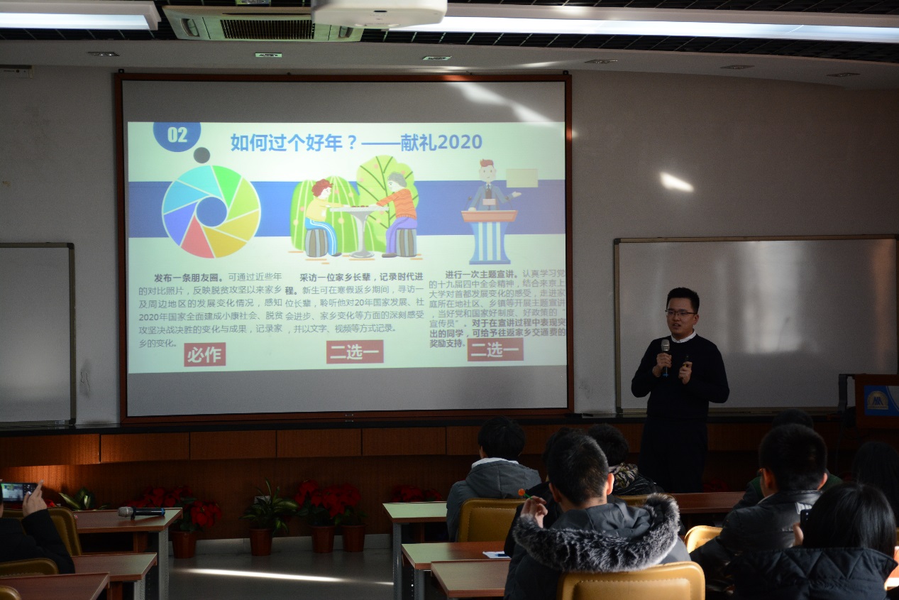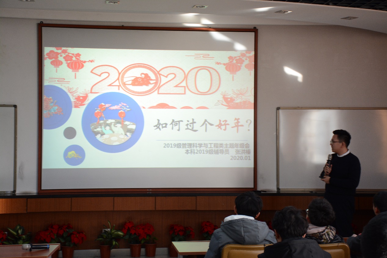 1月14日,2019级管理科学与工程类专业召开“如何过个好年”主题年级会,年级会由辅导员张洪榛主持。