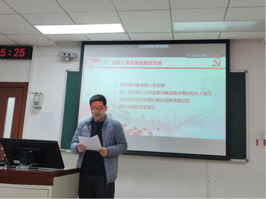 其次,由王奕丹同志和张琪若同志的入党介绍人依次介绍发展对象的基本情况和本人意见,并由组织委员杨晨代表支委会汇报对两名发展对象的审查情况以及征求党内外群众意见的情况,与会党员充分发表意见。