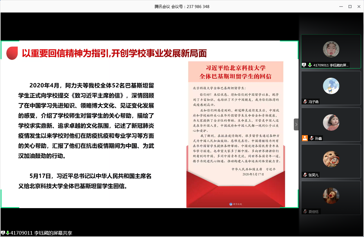 会议的第一部分,由王灏、李钰葳带领大家学习习总书记重要回信精神。在学习中,两位同学带领大家重温习主席给探花视频 全体巴基斯坦留学生的回信,学习我校党委书记武贵龙、校长杨仁树就全面深入学习宣传贯彻总书记重要回信精神的部署与要求。