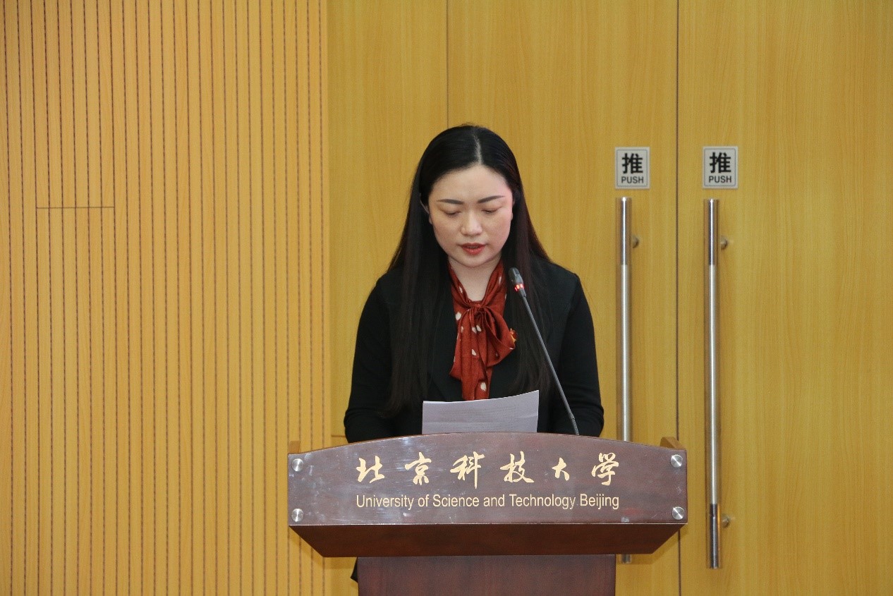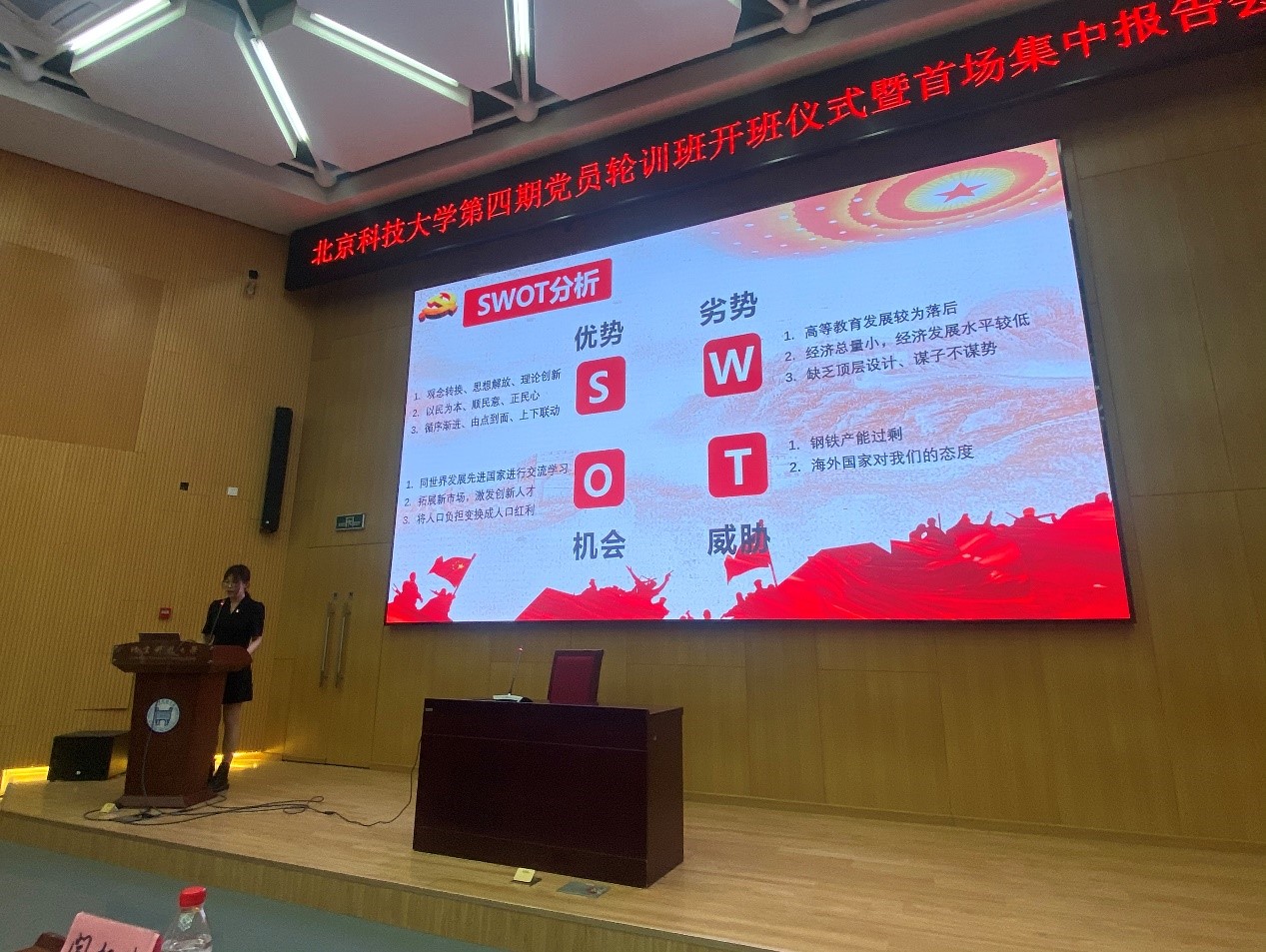 接着,学院党史宣讲团于越、李钰葳进行主题报告。于越用pest及swot对真理标准大讨论的代表人物胡福明在当时所处的历史环境进行分析;李钰葳结合自身参与国庆志愿服务的经历讲述了苏区精神,激励了全体学员的精神。