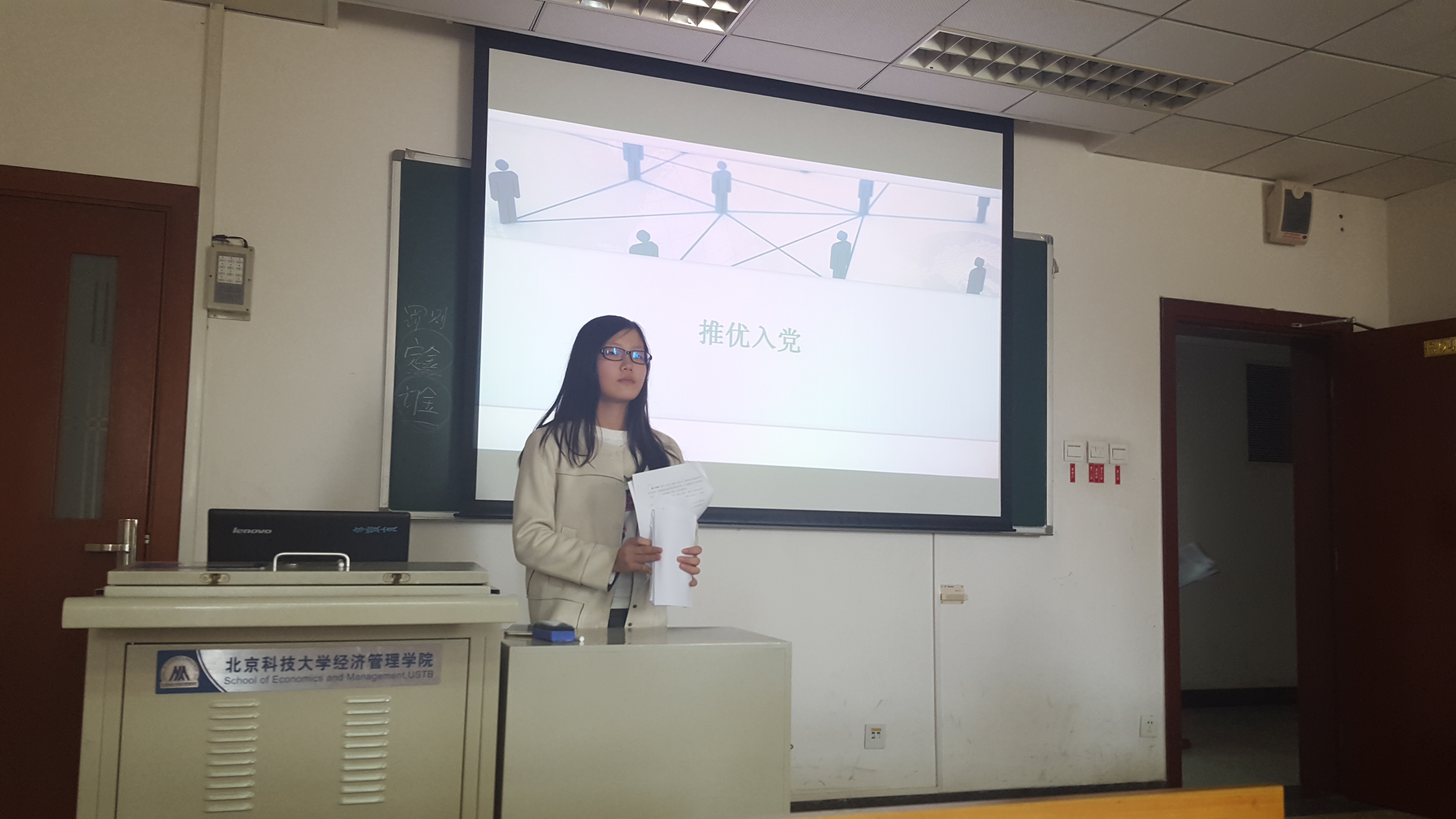 本次大会由团支书主持。会议主要分为四个部分:推优入党介绍,候选人自我评述,全体投票推选,和唱票环节。首先,团支书对推优条件和名额分配进行简要说明。紧接着,八位候选人依次登台进行简练的自我评述。每一位候选人都对自己的优缺点和入党动机进行了系统的评述。接下来进行投票选举,经过了三轮的投票后,最终选出了窦安,胡倩,赵曼三人为入党积极分子。