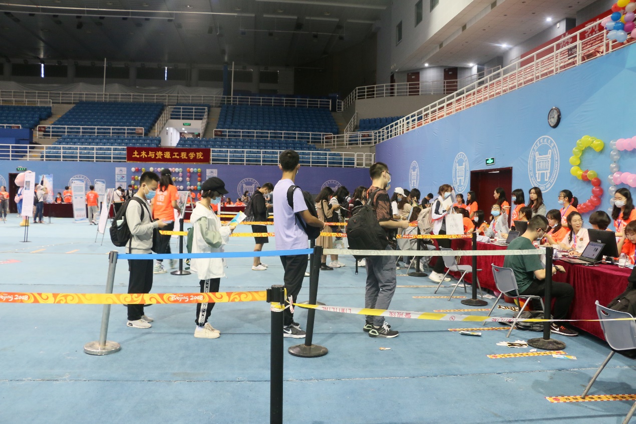 上午8时,第一位经管新生走进了体育馆。疫情原因,本次新生报到不得出现人员聚集排队现象,这也对志愿者们的工作速度和效率提出了更高的要求。但志愿者们丝毫不见慌乱,有条不紊地进行,超水平完成学校要求,快速完成每位新生的报到工作。
