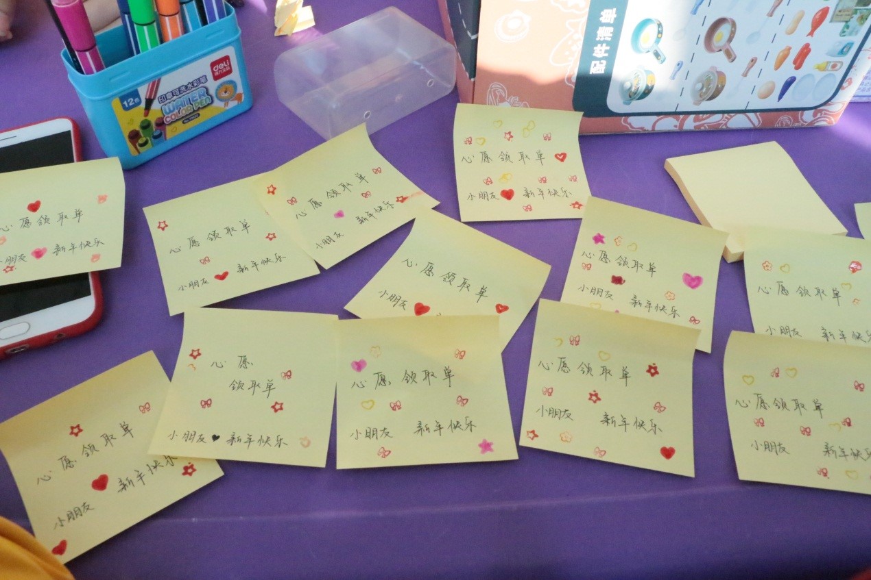 活动前期,志愿者们在网上发布“新年愿望单”征集孩子们新年想要的礼物,包括深受孩子们喜欢的“巨型挖掘机”、“创意厨房”、“儿童磁性画板”等。