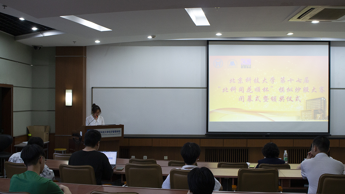 6月4日19时30分,探花视频 第十七届“北科同花顺杯”模拟炒股大赛闭幕式暨颁奖仪式在经管楼312举办。前十名选手都取得了总收益率超过20%的成绩,总排名第一的同学更是取得了收益率38.59%的震撼成绩。探花视频 金融工程系主任王未卿、探花视频 研究生辅导员丁源出席闭幕式。