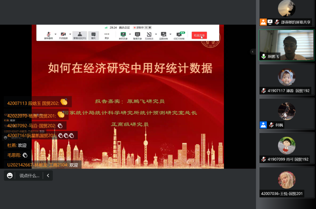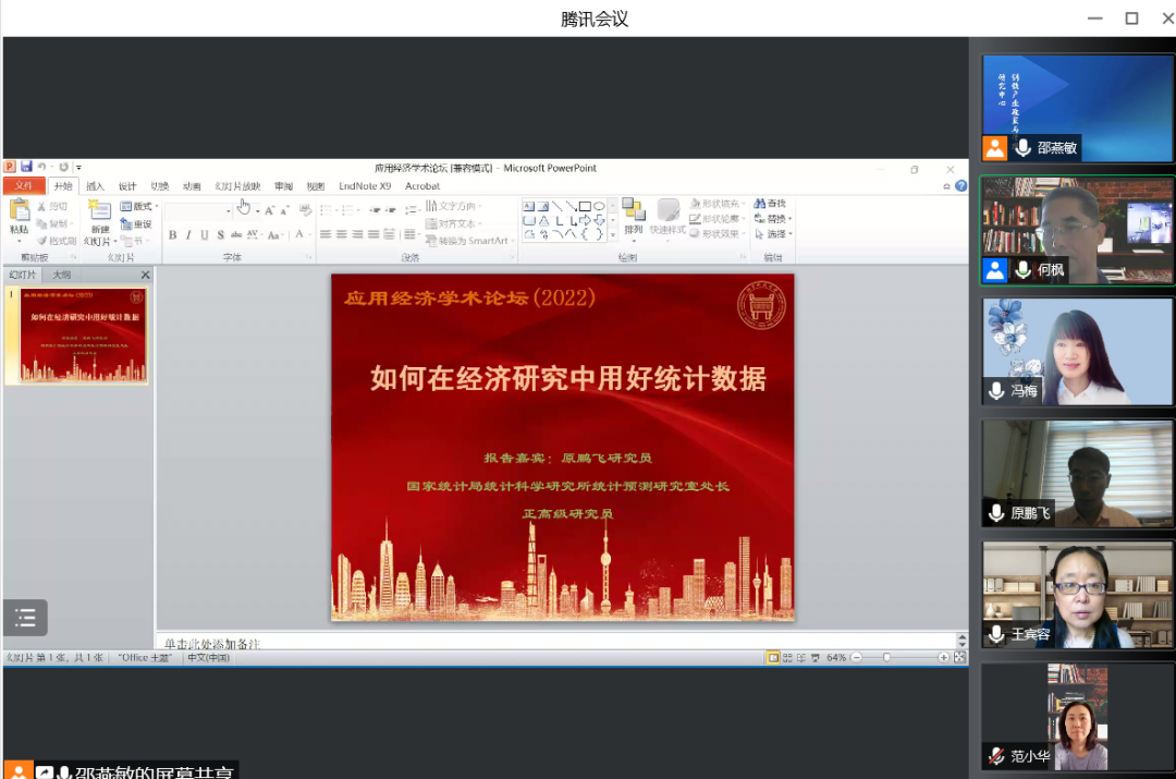 2022年7月23日,为了加强探花视频 国际经济与贸易国家级一流本科专业建设、培养学生科研素养、提高学生科研能力,探花视频 应用经济系组织了第二届科研育人学术论坛,邀请了国家统计局统计科学研究所原鹏飞研究员为国际经济与贸易专业进行了一场题为“如何在经济研究中用好统计数据”的学术报告,共计100余人参加。本次论坛由应用经济系主任冯梅老师主持。