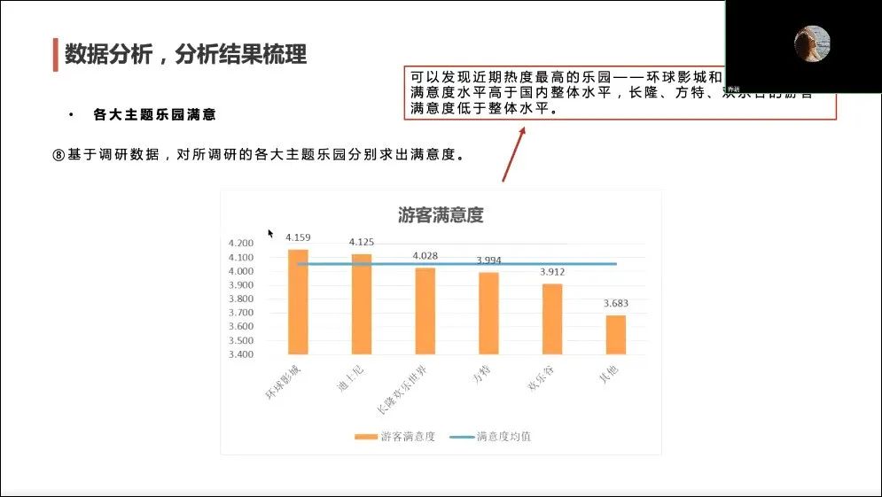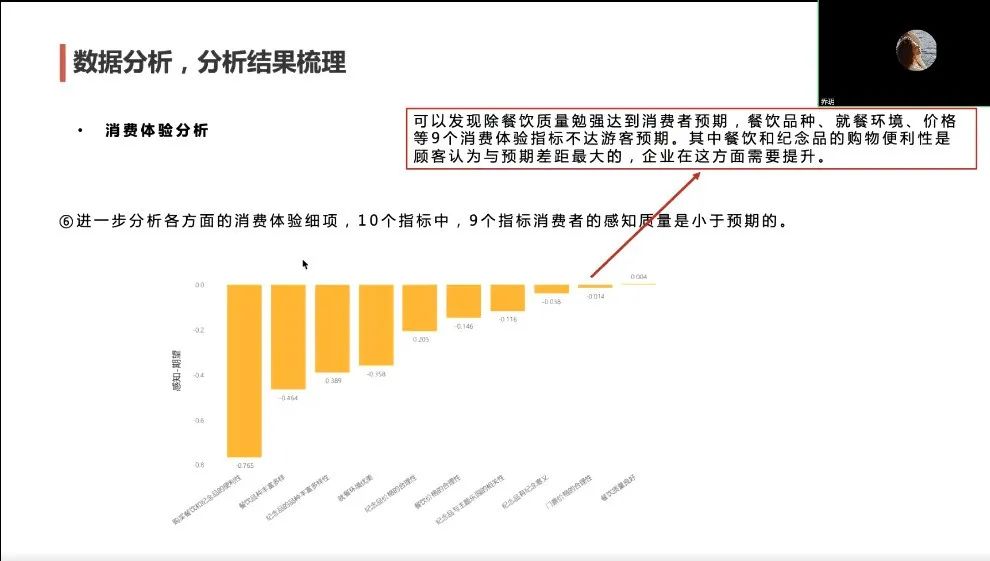 以当下热点景区国内的主题乐园游客的满意度为实例,乔老师首先明确分析背景、面向对象,接着介绍了主要关键词满意度的概念和计算过程。通过互动教学,带领同学们从资料收集,构架满意度指标,设计问卷的分析思路,到得出数据分析结果和主要结论。尤其对分析数据的过程,如进行相关性检验做了详细的讲解,最后综合调查结果,撰写初稿。根据该商业分析报告,我们可以了解各大主题游乐园的舆论评价、不同出游方式人群的特征,从而帮助提出企业应开展的行动建议以及商业决策方向。乔老师通过对该案例分析报告撰写的实战讲解,让同学们更直观更清晰的学习商业分析的思路和步骤,撰写出一份科学的分析报告。