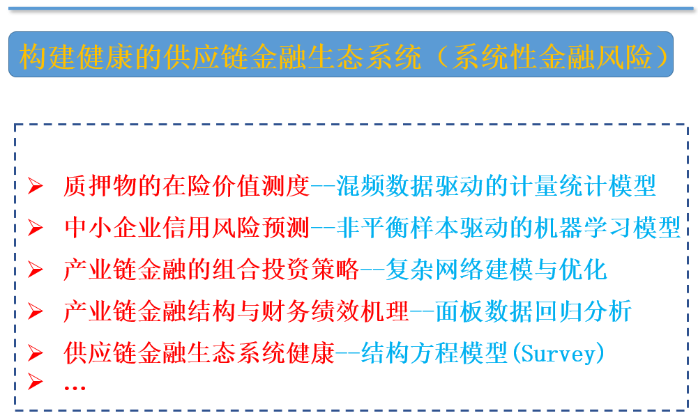 第二部分,从模型驱动与实证研究两种研究视角,汪老师讲述了数字供应链生态系统多维风险治理的具体研究。通过对混频数据驱动的质押物在险价值测度、考虑非平衡采样机器学习的中小企业信用风险预测、复杂网络视角下产业链金融投资策略优化、产业链联合投资网络结构与财务绩效的作用机理、数字供应链金融生态健康性风险评价及其传染机制的具体讲解,详细介绍了如何治理数字供应链金融多维风险。