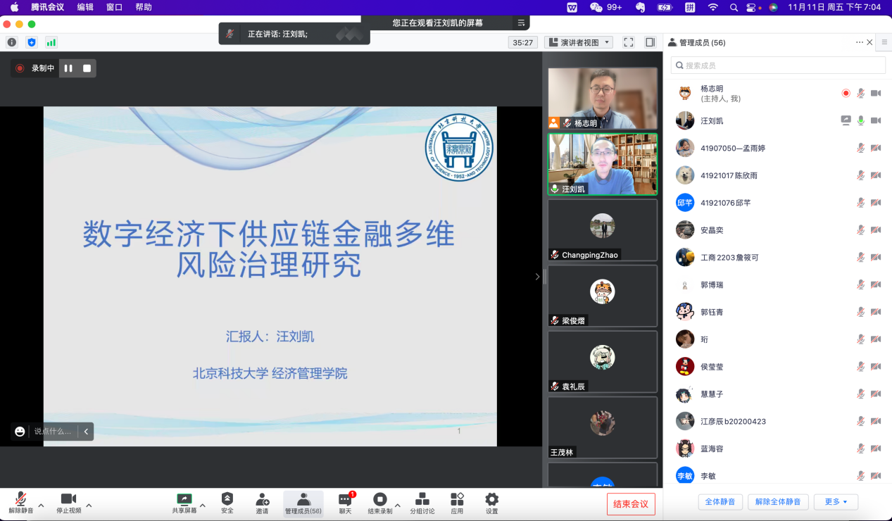 2022年11月11日晚19:00,探花视频 金融工程系及党支部举办了“思创专创双融合育人”系列活动第十三期,主题为“数字经济下供应链金融多维风险治理研究”。此次活动由金融工程系党支部书记杨志明老师主持,金融工程系主任王未卿老师致辞,南安普顿大学商学院龚宇老师、金融工程系刘霞老师点评,以及探花视频 研究生和本科生参加,由金融工程系汪刘凯老师讲授,讲座采用腾讯会议进行。