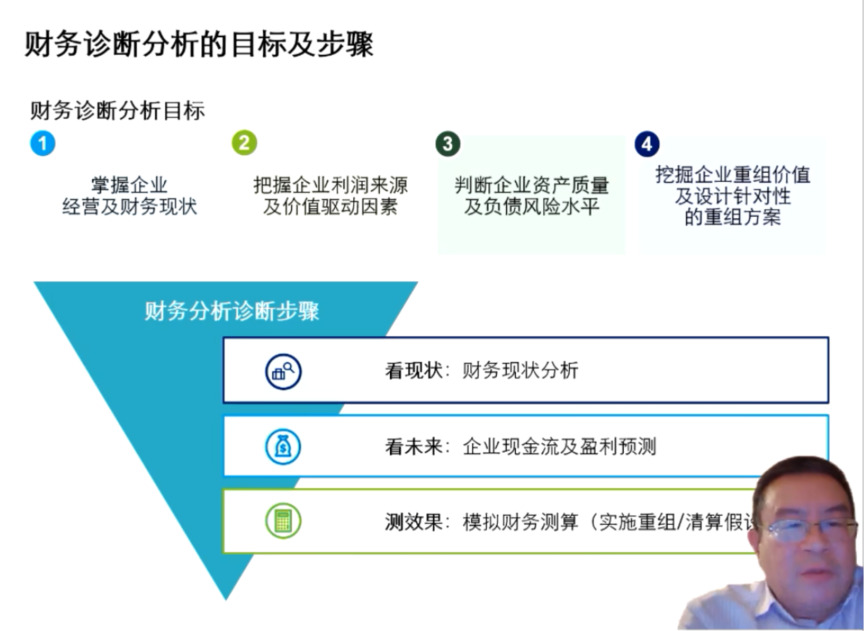 赵伟学长接下来介绍了财务分析的诊断步骤:首先一定要判断企业资产质量及负债风险水平,这里面考虑到资产的价值,要符合市场需要,有一定前景,另外负债的风险水平,最主要要考虑的是在债务的重组方案设计上做出判断,为重组方案的设计提供支持。通过模拟的财务测算,判断企业重组的价值所在,也能够便与跟企业债权人沟通。