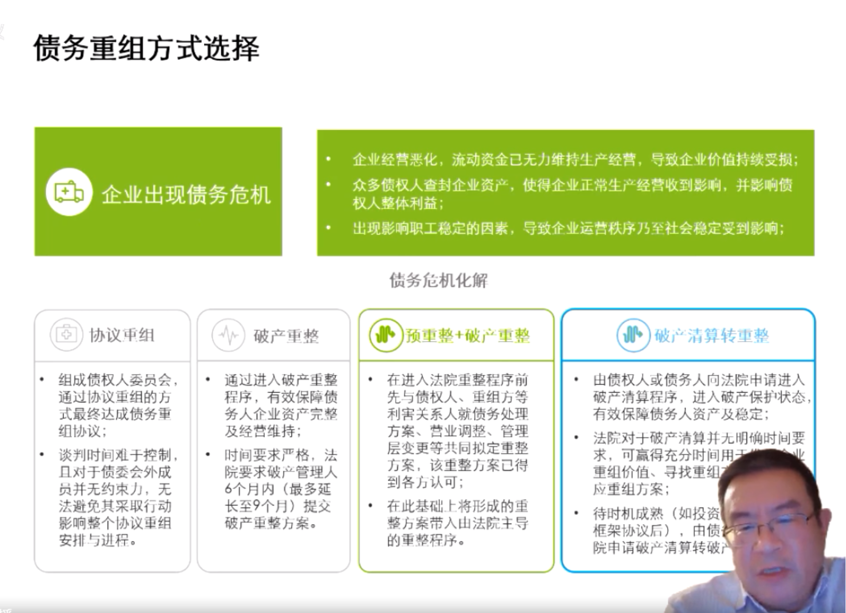 对于债务重组方式与对应的选择,赵伟学长谈到,当企业经营恶化,流动资金已无力维持生产经营时,就将导致企业持续受损,并且会有众多债权人查封企业资产,这一系列的现象,都表明企业已出现债务危机。如果企业面临债务重组,可以选择不同的债务重组方式,如协议重组、破产重组、预重整+破产重整,破产清算等。