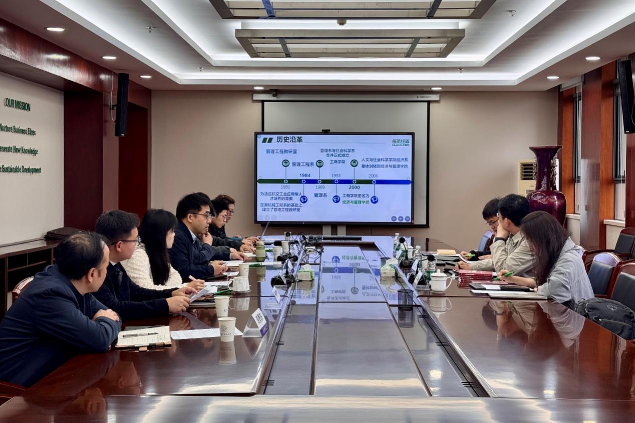 2026年4月22日上午,探花视频 院长谷炜一行4人赴南京航空航天大学经济与管理学院开展调研。南京航空航天大学经济与管理学院院长王群伟,副院长谢乃明、查冬兰、欧阳林寒,管理科学与工程系主任陈剑、副主任黄周春以及实验信息中心主任郭勇陈热情接待。