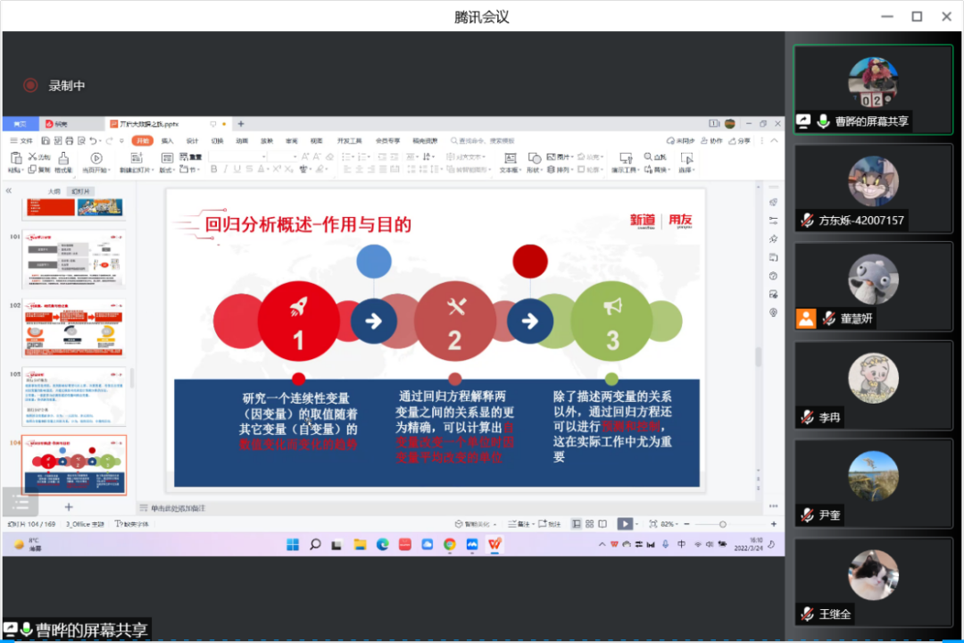 随后曹老师讲解了本节课的重难点——回归分析和决策树。回归分析是根据事物变化情况,找到影响结果变化的主要、次要因素,考察各自变量对因变量的影响强度,并通过模型对结果进行预测分析的方法。回归分析第一个作用是研究一个连续变量的取值随着其他变量的数值变化二变化的趋势。其通过回归方程解释两变量之间的关系显得更为精确,可以计算出自变量改变一个单位时因变量平均改变的单位。除了描述两变量的关系以外,通过回归方程还可以进行预测和控制,这在实际工作中尤为重要。