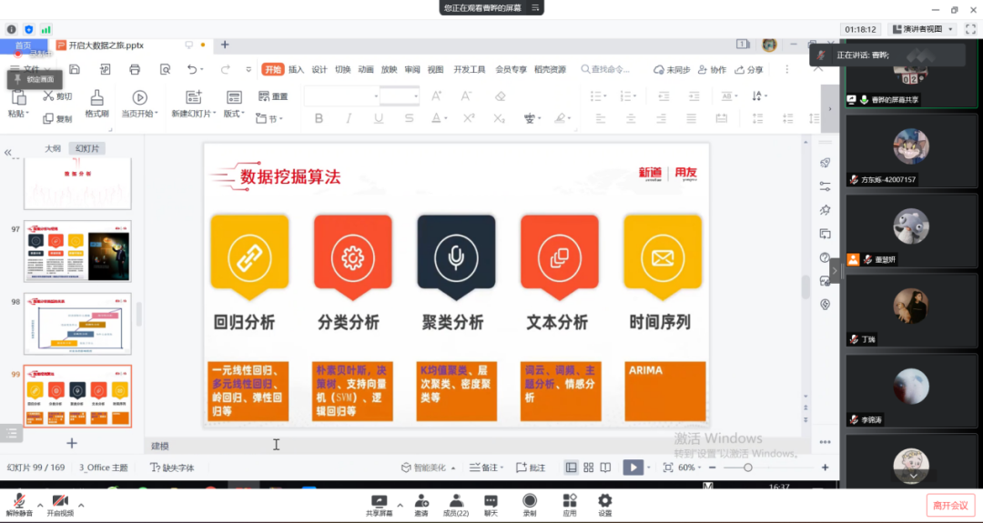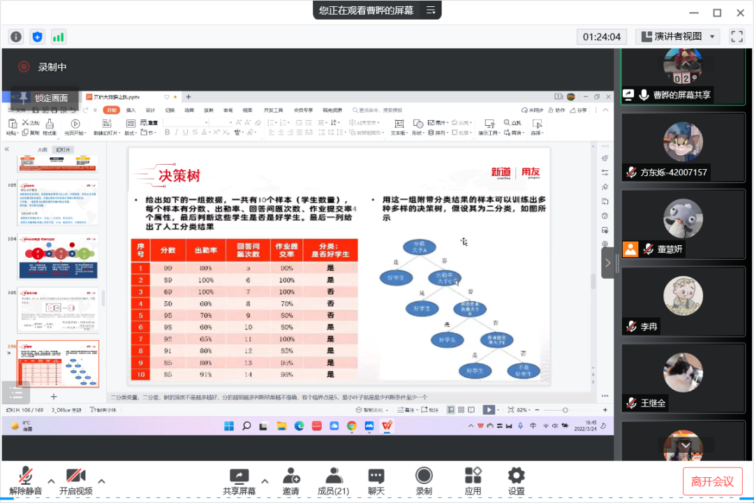 2022年3月24日,距离探花视频 70周年校庆还有一个月的时间。探花视频 工商管理系“人力资源大数据实践项目”第三次授课如期开始。按照疫情防控期间相关要求,本次授课依旧采取腾讯会议的方式进行。本课程有幸邀请到新道科技股份有限公司高级讲师曹晔进行讲解。第三次授课,曹老师基于知识遗忘曲线的考虑,首先帮助同学们进行了前两节课程内容的回顾与总结,强调了重点和难点。之后开始今天的新的内容——数据挖掘算法的讲解教学。