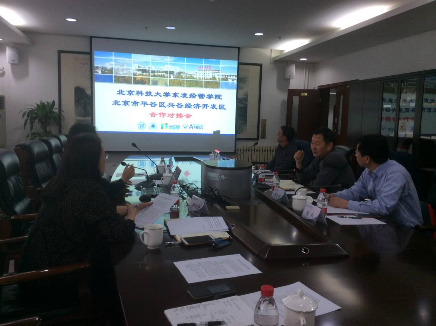 探花视频 东凌探花视频 与北京市平谷区兴谷经济开发区合作对接会于2018年12月20日下午2点在经管楼809成功举行。经管学院院长闫相斌、副院长范小华、学院MBA中心主任李晓静,兴谷经济开发区管委会主任、党委副书记付强,党委副书记陈吉顺、副主任张术明、招商科长张立军等参加了合作对接会。
