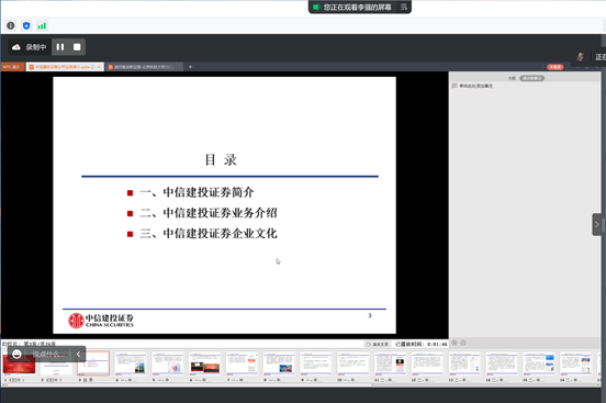 随后,李强总介绍了中信建投的历史发展历程,公司主要业务范围,师生从中了解到中信建投是国内行业领先的综合性证券公司,公司开展业务齐全,尤其是投资银行业务,常年位居国内前三甲,财富理财产品也十分丰富,且富有竞争力。此外,李强总还具体介绍了投行业务、固收业务、证券经纪业务、资管业务、证券金融业务、机构业务、研究业务、公司探花视频体系等。