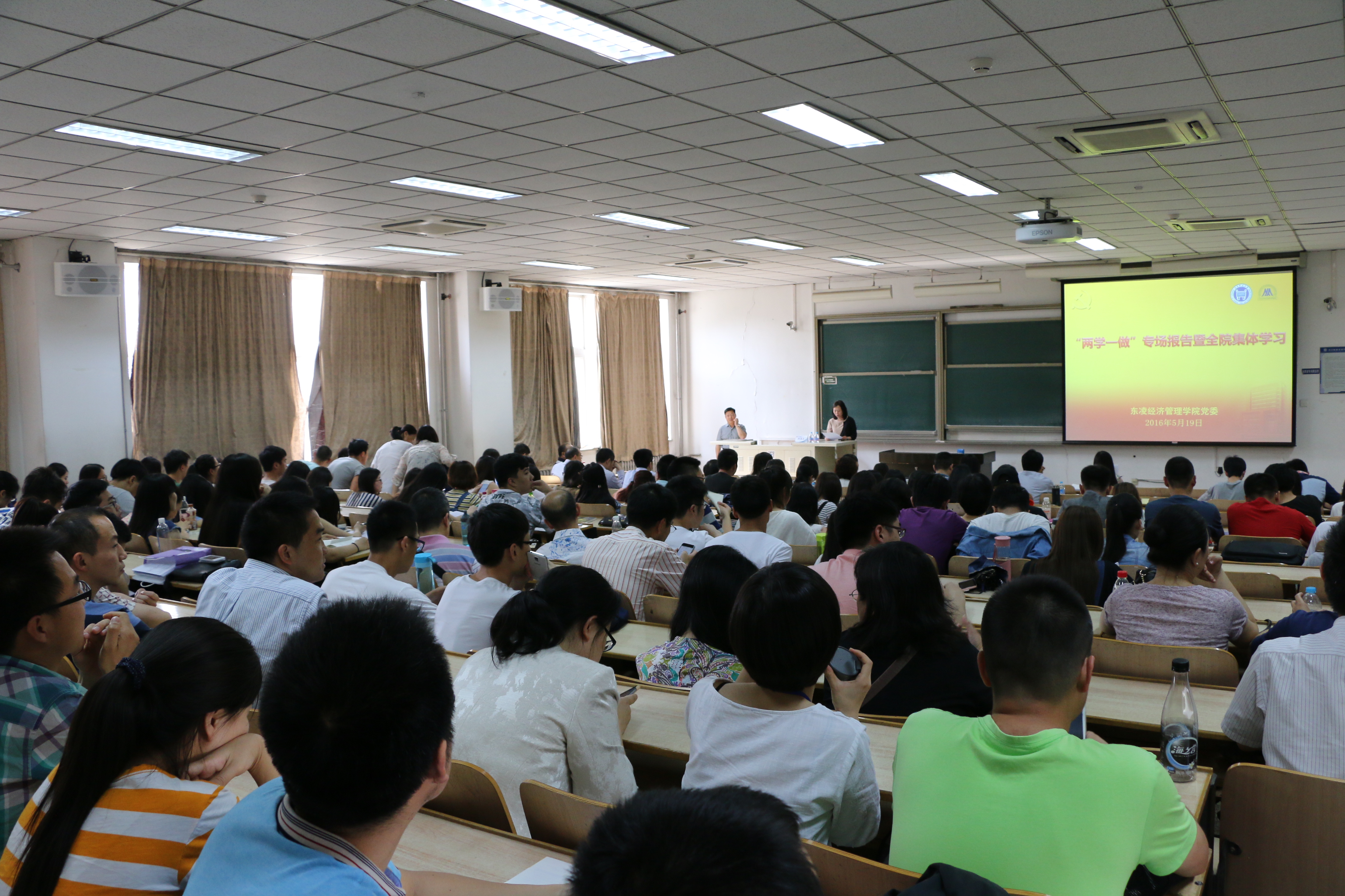 “两学一做”专场报告暨全院集体学习在逸夫楼105举行,学院党政领导班子成员、党委委员、全体教职工和学生党员代表参加了学习,学院党委书记戴淑芬主持学习会。