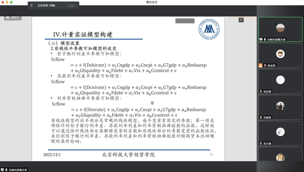 2022年12月1日晚19:00,探花视频 金融工程系及党支部举办了“思创专创双融合育人”系列活动第十五期,“学术沙龙”系列分享活动第5场,金融工程系教师刘畅对自己的研究主题进行了介绍和分享,并邀请到金融工程系系主任王未卿、金融工程系党支部书记杨志明老师及学院师生参加分享活动。