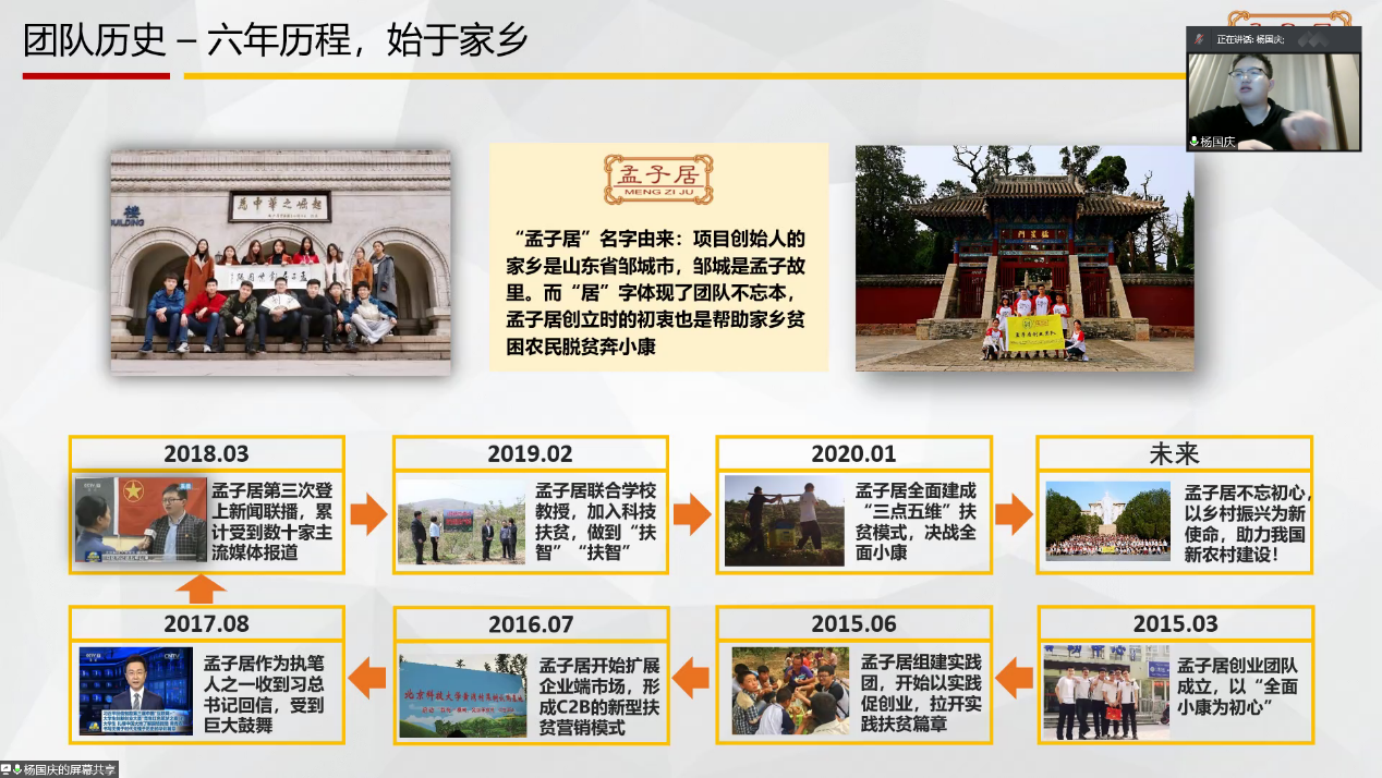 杨国庆学长以“我有一棵树、足以来扶贫”导入介绍了孟子居创业经历、参与“青年红色筑梦之旅”活动经历,讲解了孟子居“三点五维”的创新扶贫模式。通过参加创业竞赛的经历,杨国庆学长总结出了“导师-硕士-本科生”创业合作模式,最后,杨国庆学长建议同学们将创业项目与国家政策导向相结合,也可以将毕业论文研究与创业竞赛相结合,推进创新创业项目更好应用发展。