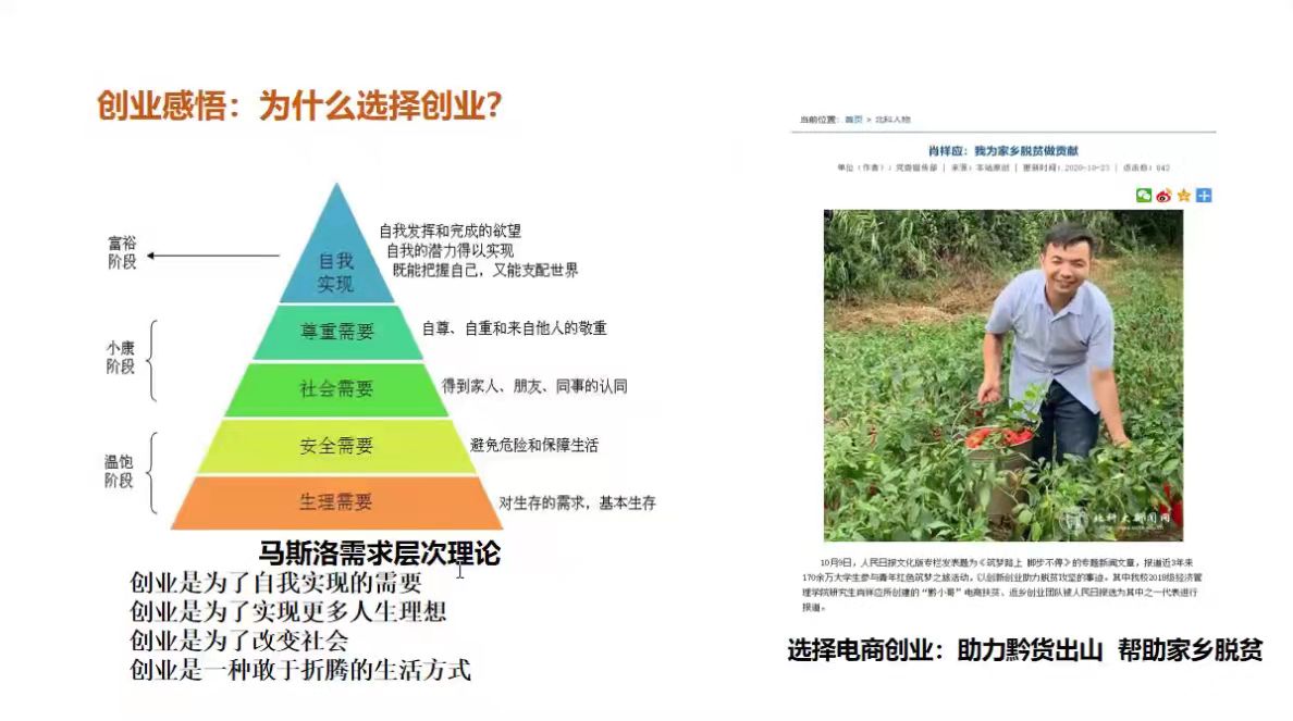 肖祥应学长从创业经历、创业感悟、创业项目、参赛经验四个方面进行了分享,首先介绍了自己创办“看点网”的创业经历和黔小哥“助力黔货出山、帮助家乡脱贫”的电商创业故事,在电商创业经历中提出了“五维一体”的创新模式扶贫模式,以用户需求驱动区域网红产品打造,利用全程导师制孵化网红大学生带货团队。通过参加创业竞赛,肖祥应学长思维、学习、表达、撰写商业计划书的能力大幅提升,同时收获了同学校友的友谊和精神物质的奖励,对于求职也提供了切实的帮助。