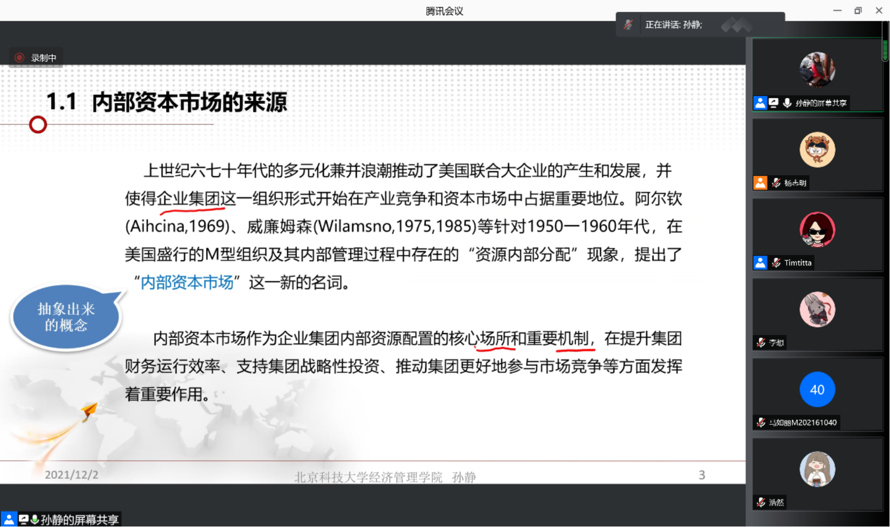 第八期孙静围绕着《内部资本市场前沿理论与实务探究》进行主题分享。内部资本市场理论诞生于上世纪七十年代,是随着企业集团这一经济组织形式的出现而产生和不断发展的。在先后经历了“效率之争”、多元化折价等问题争论后,国内外有关企业集团内部资本市场理论的研究呈现出了新的发展趋势,在研究视角、研究内容、研究样本、研究方法等方面均有所突破。本次讲座将总结并梳理内部资本市场相关问题的前沿研究,并试图提出有价值的未来研究方向。本期学术沙龙分为四个部分。首先,介绍了内部资本市场的来源与含义,及内、外部资本市场的关系。其次,介绍了内部资本市场的相关理论,包括其诞生的理论基础,关于内部资本市场的西方经典理论,以及内部资本市场领域针对新兴市场的理论拓展等。然后,介绍了内部资本市场理论在中国的发展,包括该理论在中国的研究进展和应用实例等。最后,指出了未来可能的研究方向和可能会应用到的研究方法等。