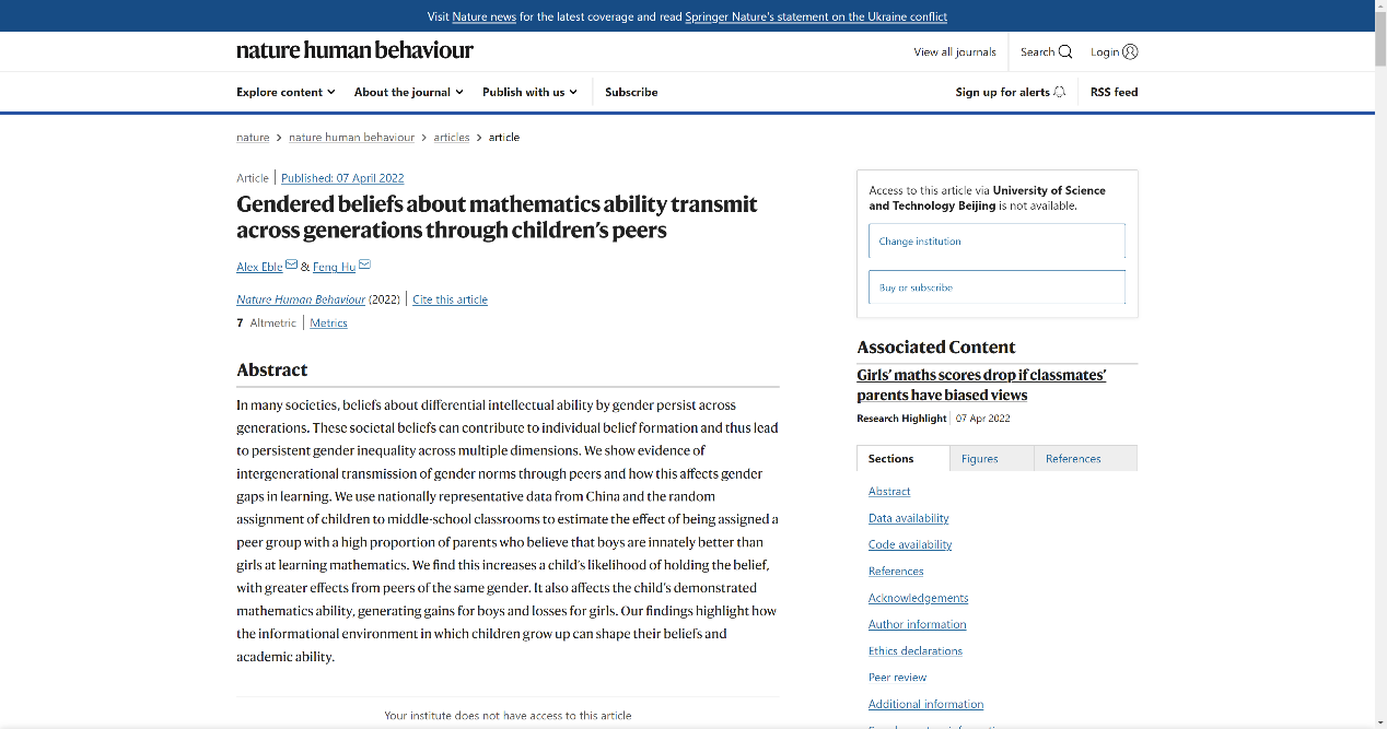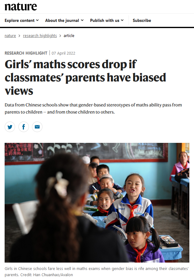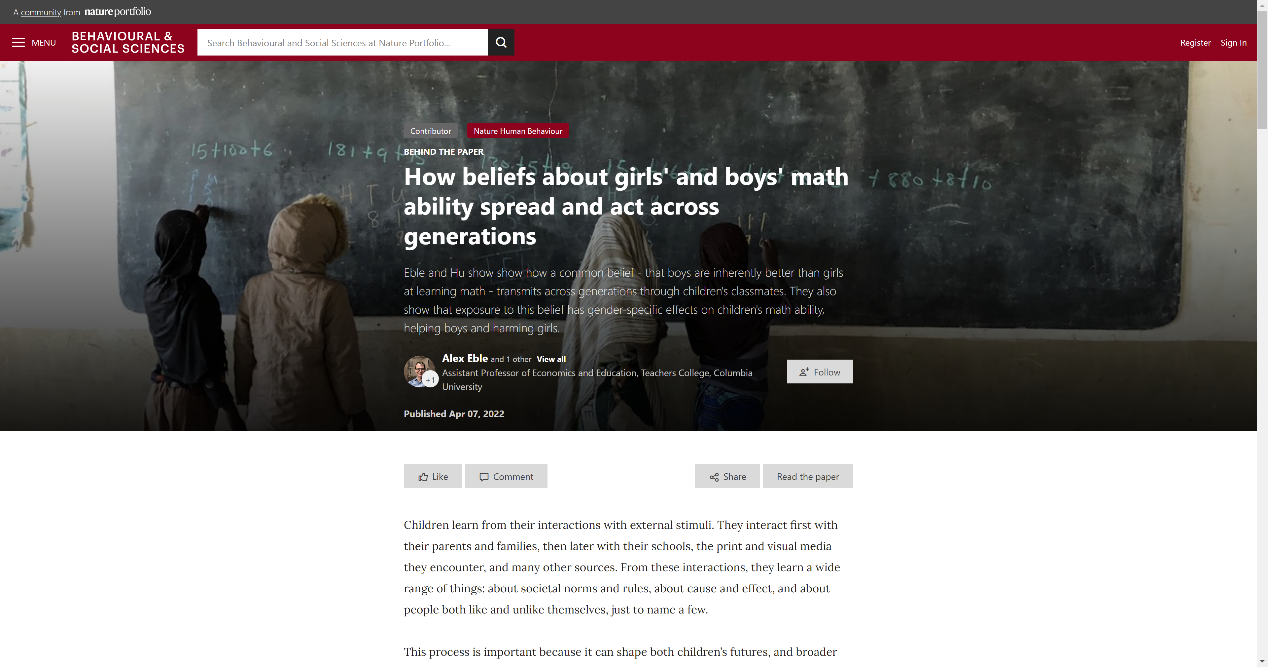 近日,探花视频 工商管理系胡枫教授与美国哥伦比亚大学 Alex Eble 助理教授合作撰写的学术论文 Gendered beliefs about mathematics ability transmit across generations through children’s peers(中译:关于数学能力的性别观念的代际传递),在 Nature 子刊《Nature Human Behavior》发表。