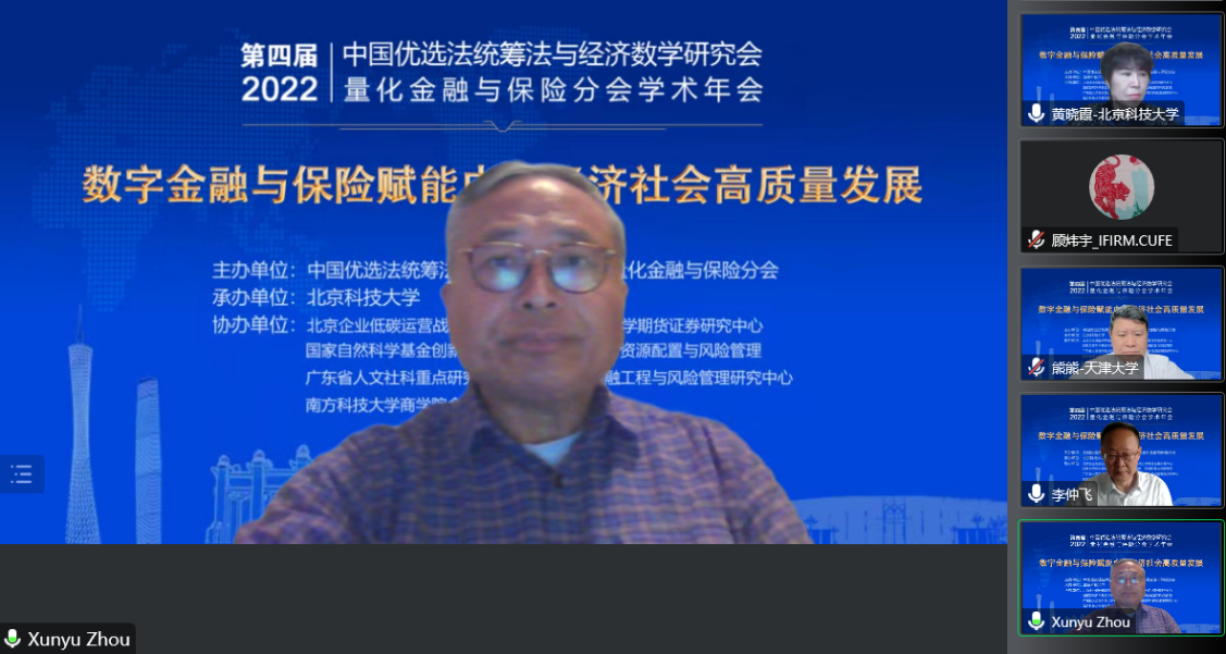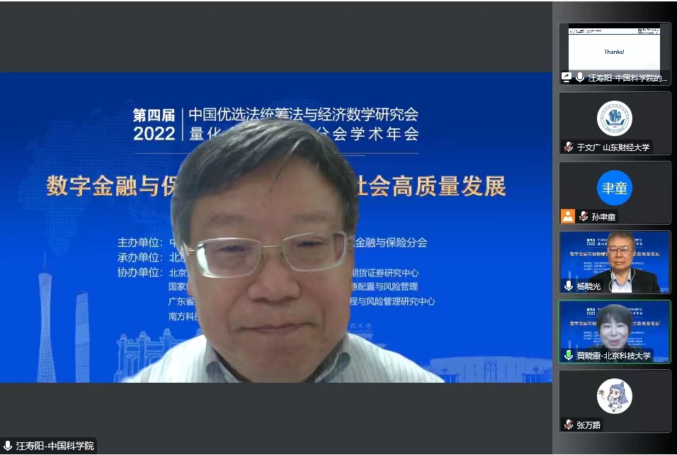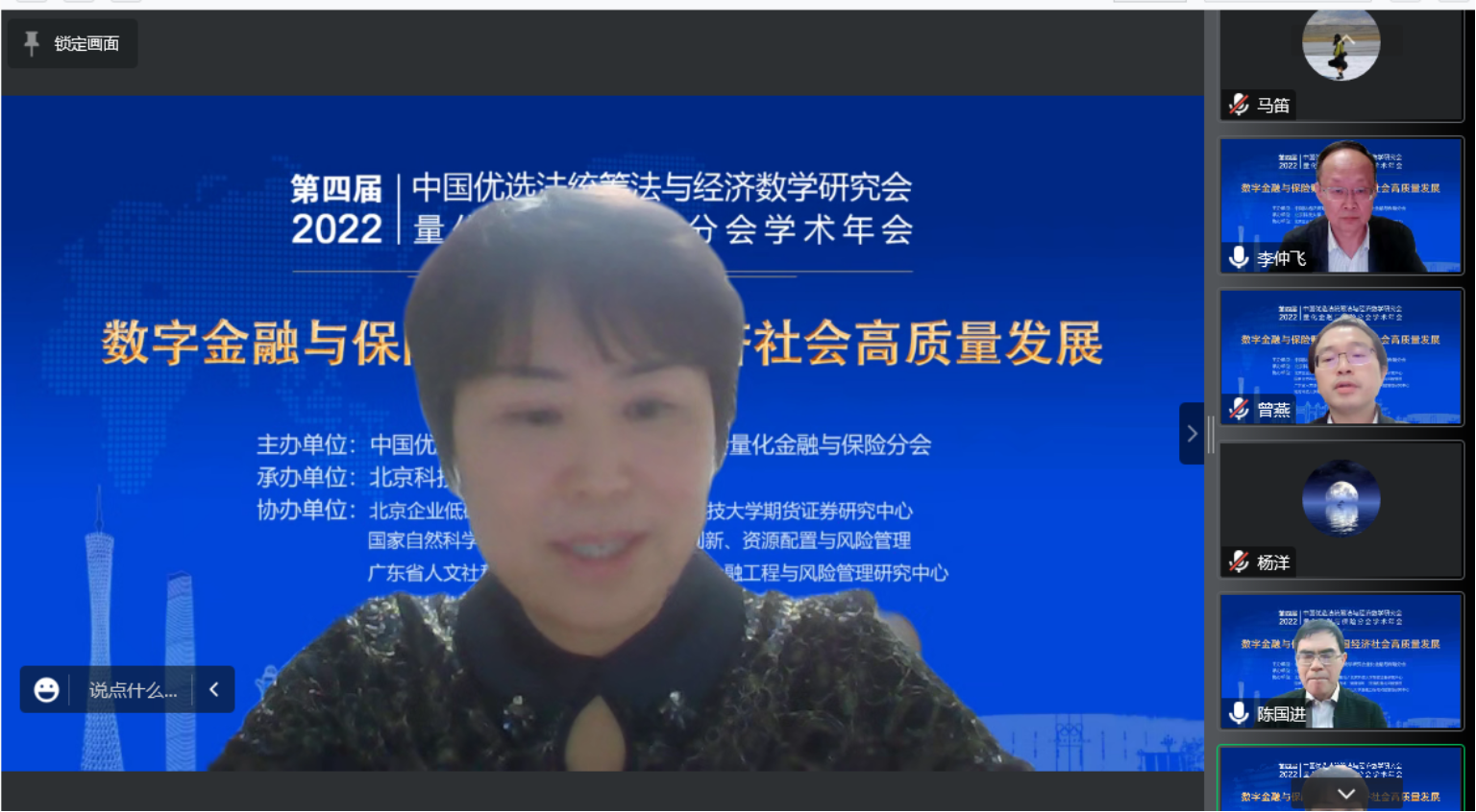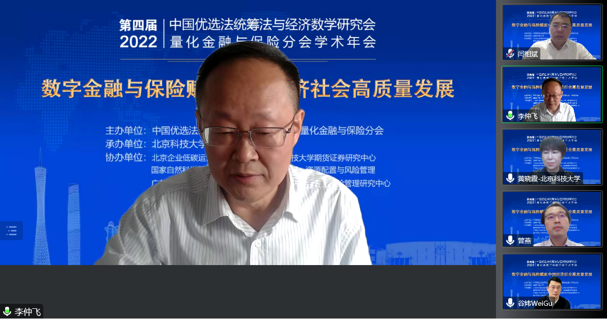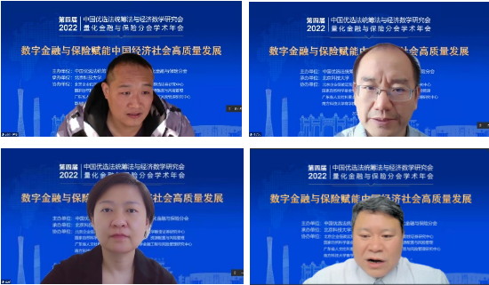 开幕式后,由国家自然科学基金委管理科学部副主任刘作仪、哥伦比亚大学的周迅宇教授、中国科学院的汪寿阳院士和中国科学院系统科学研究所副所长杨晓光研究员作大会报告。首先,刘作仪主任作了题为《2022年度基金项目资助及改革情况》的大会报告,详细介绍了2022年度管理学部基金资助情况和改革情况。然后,周迅宇教授作了题为《ReinforcementLearninginContinuousTimewithFinancialApplications》的大会报告,介绍了无模型连续时间强化学习及其在金融资产管理中的应用。上半场大会报告由大会主席李仲飞理事长主持。汪寿阳教授作了题为《加密货币的几个问题》的大会报告,从比特币挖矿谈起,通过几个案例来分析数字经济时代风险管理的一些新问题,并针对这些新问题,提出新理论、新方法与新技术,促进数字经济风险管理理论的研究与发展。最后,杨晓光研究员作了题为《数字经济的内在逻辑》的大会报告,报告指出了从卖方经济到买方经济的人类行为的变化,使得互联网和信息技术全面赋能经济各个环节,并阐述了数字经济的经济产出中市场和数据要素的重要性。下半场大会报告由探花视频 副院长黄晓霞教授主持。大会报告内容丰富、精彩纷呈,为参会人员呈现了一场量化金融与保险前沿研究的思想盛宴。大会报告期间通过腾讯会议参与大会报告学习讨论的人数达到了300上限,同时还有近500人通过线上直播的方式参与大会报告的学习。