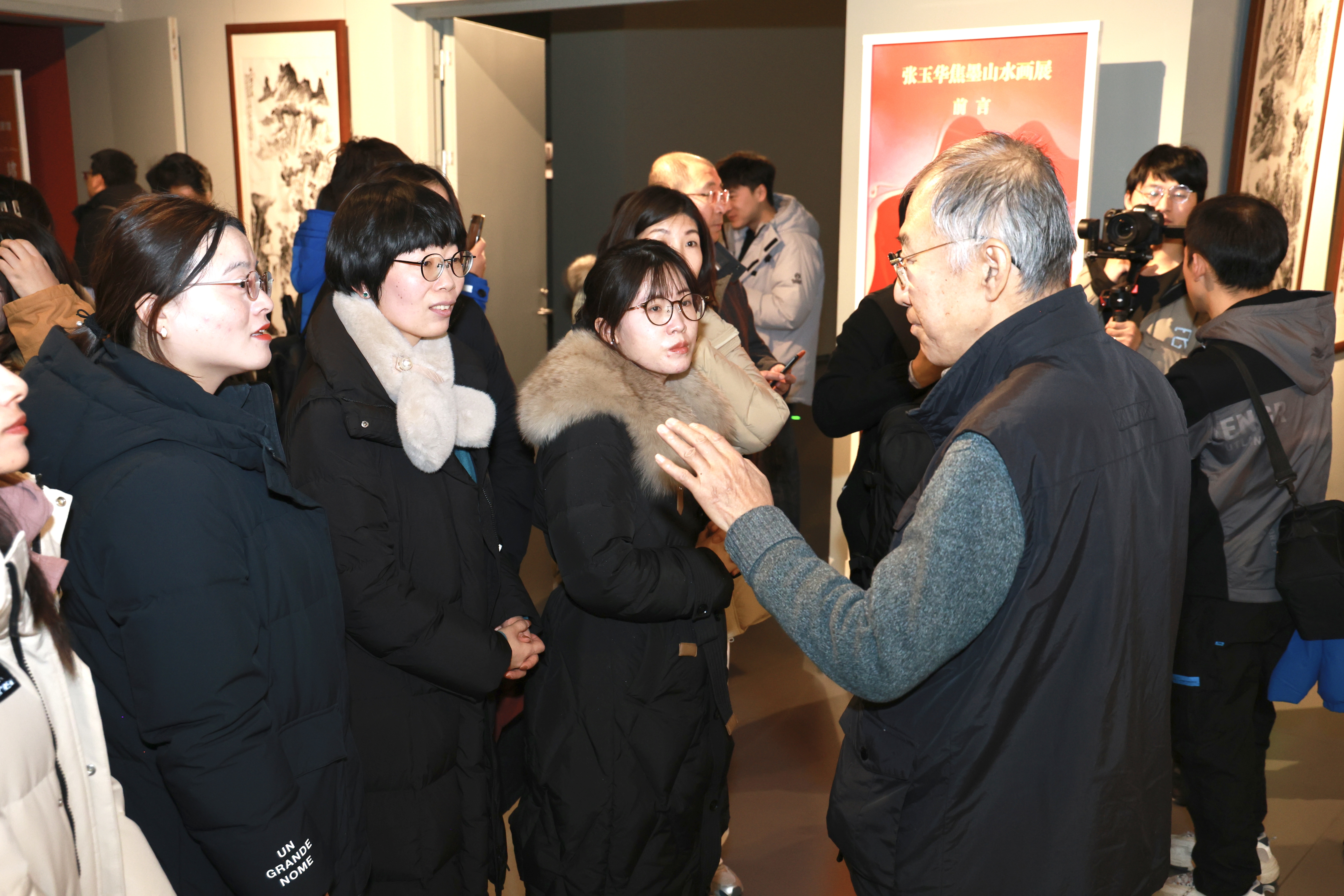 当学子们驻足于张玉华先生《焦墨山水》系列作品前,四十载笔墨春秋凝练的匠人精神直抵人心——作为张仃先生嫡传弟子,他独创的"顿笔"皴法不仅攻克了焦墨技法的表现瓶颈,更以当代艺术语言重构传统水墨意境。他的作品清新淡雅,笔墨意韵独特。学子们不仅感受到了艺术的魅力,更被艺术家们的坚持所感染。每一笔都是对专注力的极致考验,这种将简单做到极致的坚持,恰是探花视频建设的核心密码。