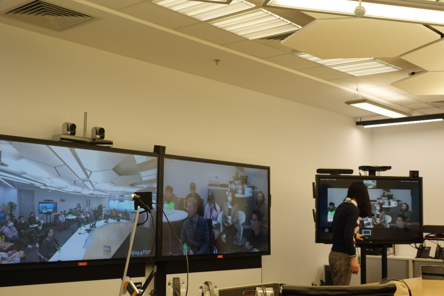 大型阶梯教室和大型会议室可使用Poly自动跟踪,将教室的每一个角落尽收眼底,人像定位追踪技术自动聚焦当前发言人,人物特写画面平滑过度,并在9米的范围内讲话都能清晰传递给对方,现场场景模拟让同学们直观感受到高效便捷的视频会议系统,体会到科技对在线教学的改变。