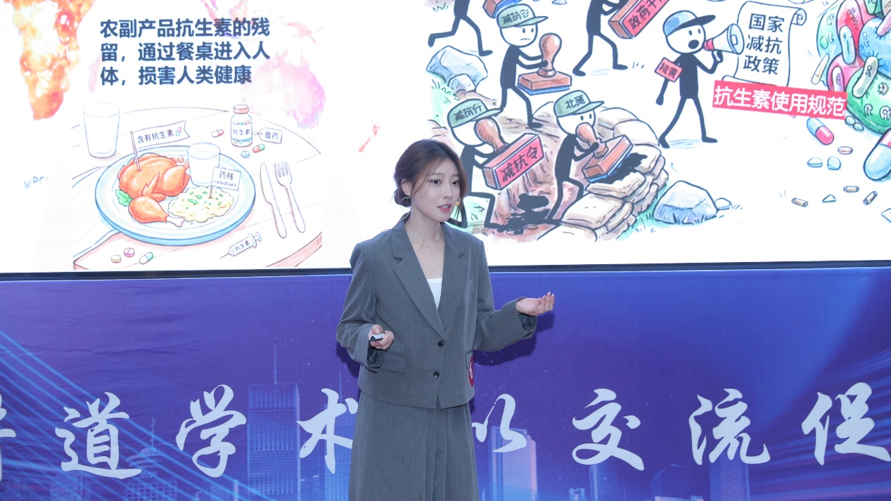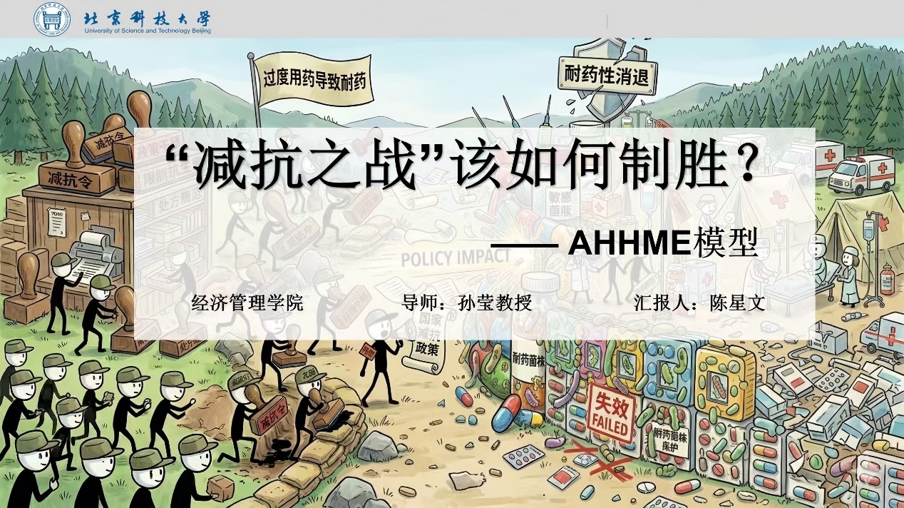 陈星文以“‘减抗之战’该如何制胜?”为题,在三分钟的时间里,讲述了如何利用AHHME模型帮助政策制定者锚定科学减抗的力度与方向。她通过改良AHHME模型,将流行病学模块与经济学模块相结合,以数据模拟政策表现,以经济检验政策成果,在制定减抗政策方面探索新方法、新思路。