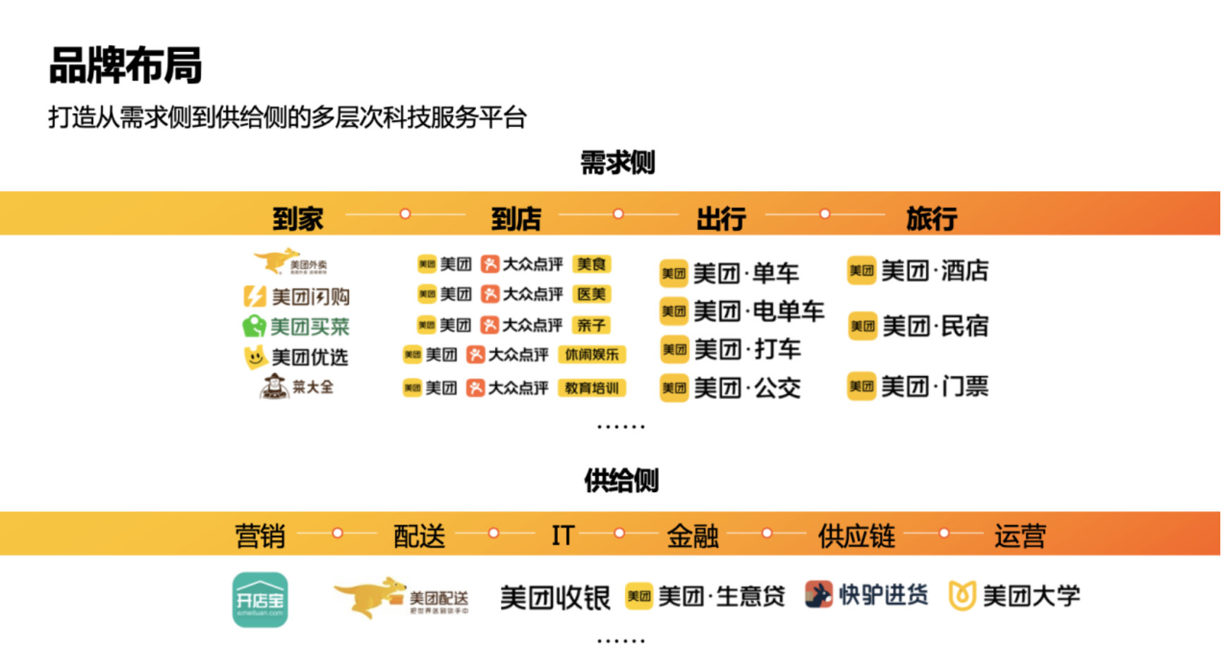 公司的战略思想“Food + Platform”,连接消费者与商户、覆盖信息流与资金流。美团作为中间平台如桥梁一般将消费者与商家端进行连接。商家端为合作商户提供支撑发展的六大服务:IT、金融、供应链、运营、营销、配送,为消费者从吃、住、行、游、购、娱几大方面提供了更多、更好、更便捷的服务。